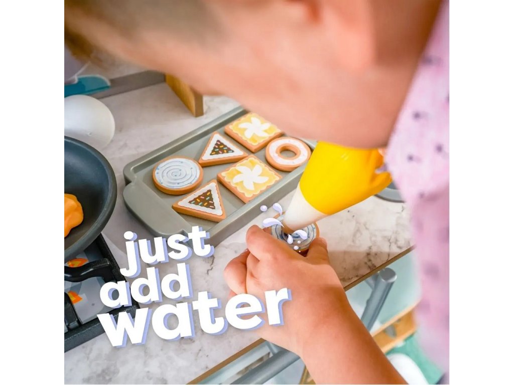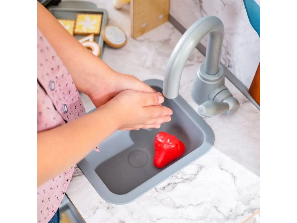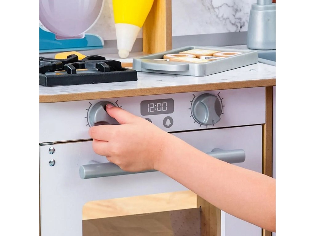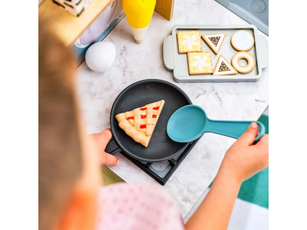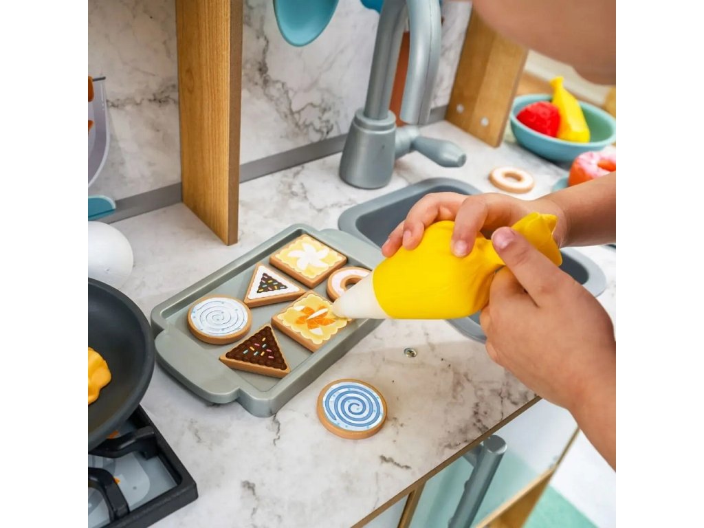 Efektivní kuchyňka Surprise Sweet z robustního dřeva nabízí nekonečné nápadité možnosti hraní. Za její pomoci můžete péct a zdobit nejrůznější dobroty! Pokud například naplníte zdobící sáček trochou vody a přiložíte jej na vrch sladkého pečiva budete svědky kouzla! Dříve bílý povrch ukáže svou skrytou barvu! Kuchyňka je dále opatřena úložnými prostory, praktickými kolíky pro úchyt náčiní, boční servírovací policí a umyvadlem s otočným kohoutkem. Hlavní vlastnosti: chladnička a trouba se snadno uchopitelnými rukojeťmiumyvadlo s otočným kohoutkemsada obsahuje 32 jídel, pánev, podnos a nádobí Dokumentace: návod k sestavení