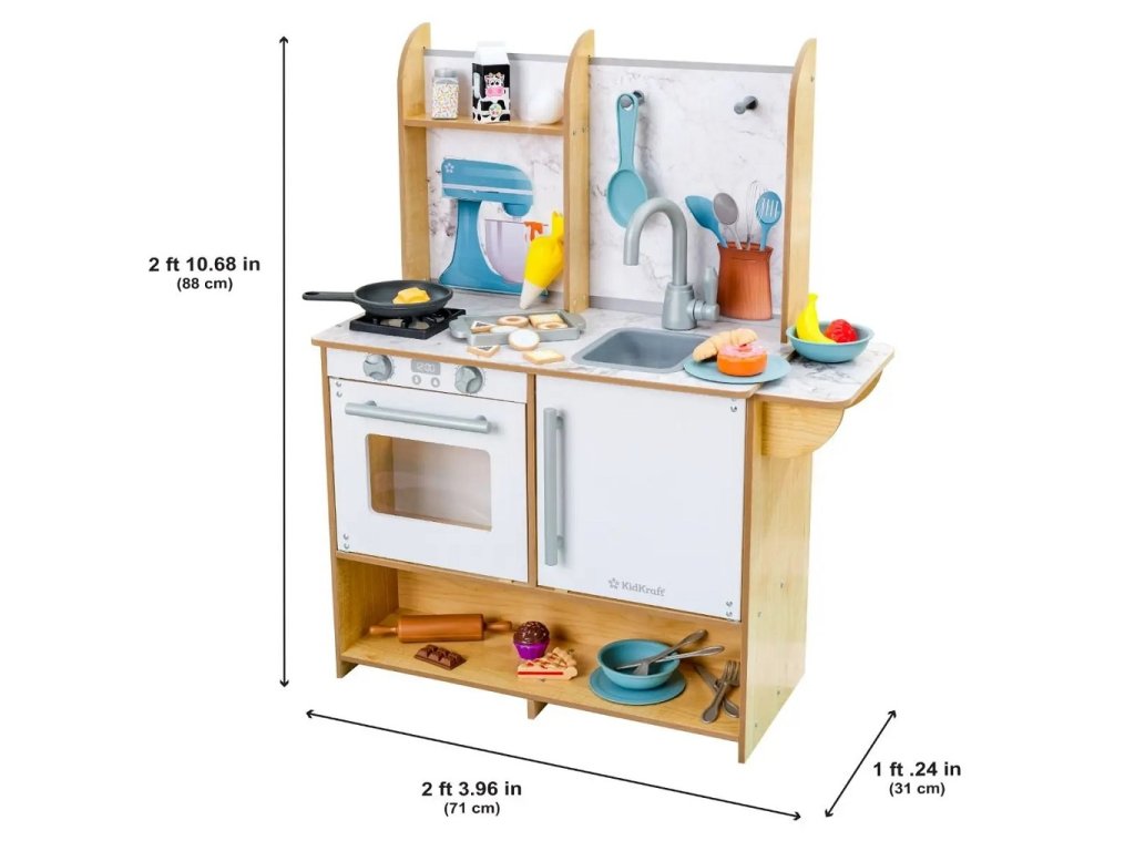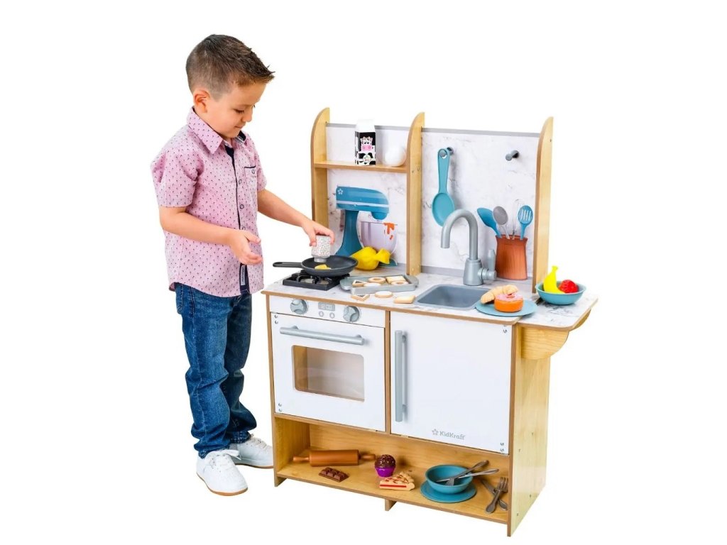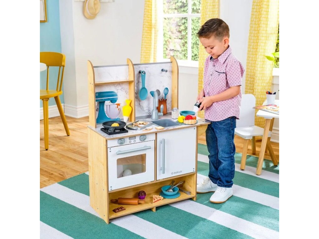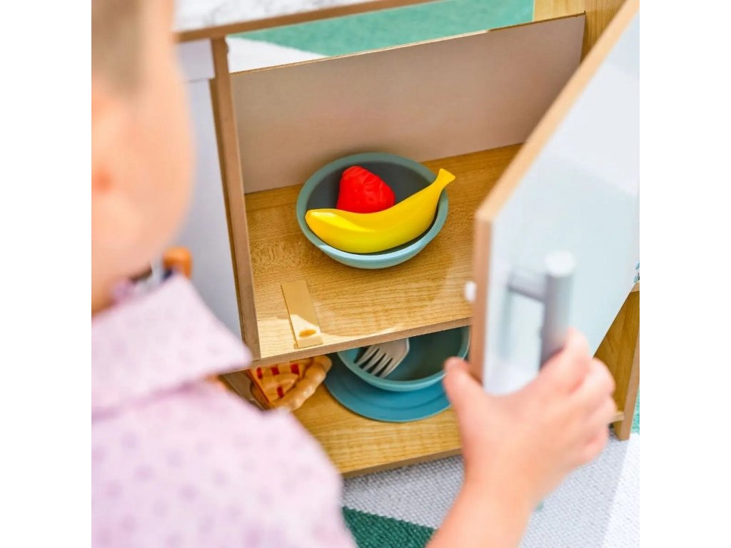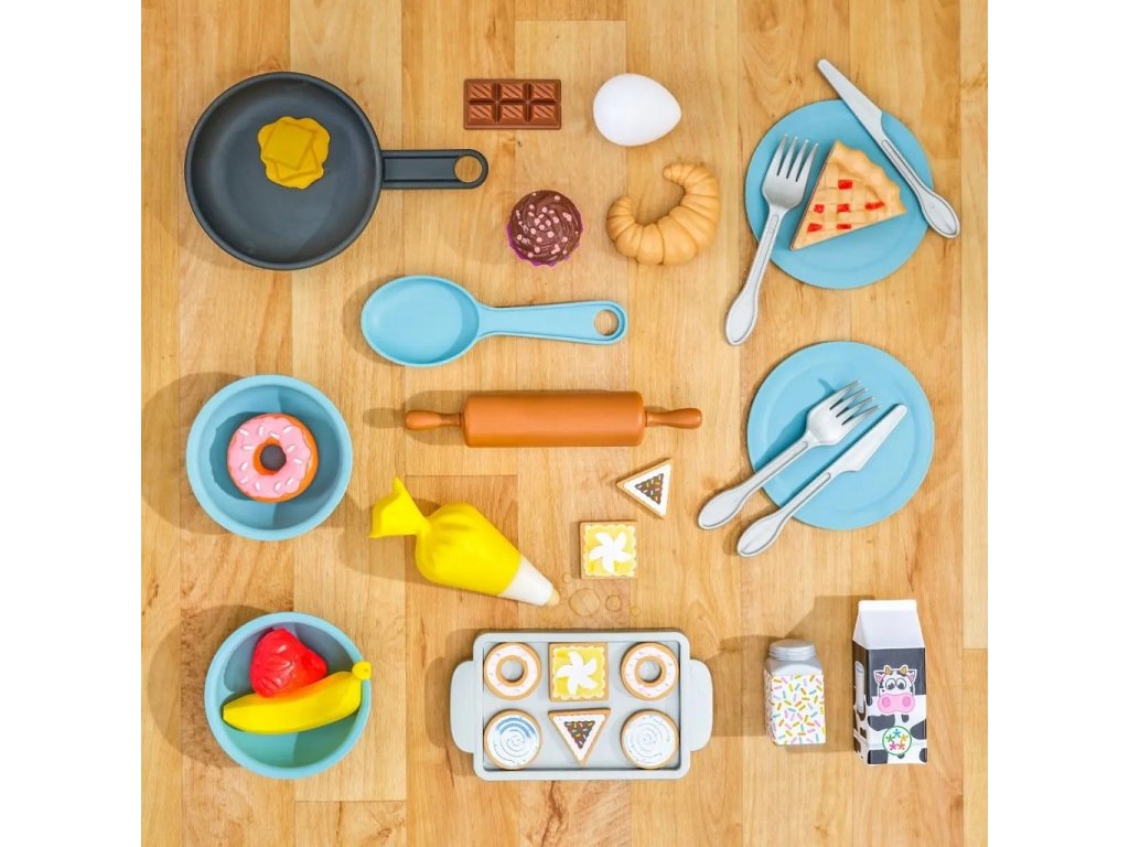 Efektivní kuchyňka Surprise Sweet z robustního dřeva nabízí nekonečné nápadité možnosti hraní. Za její pomoci můžete péct a zdobit nejrůznější dobroty! Pokud například naplníte zdobící sáček trochou vody a přiložíte jej na vrch sladkého pečiva budete svědky kouzla! Dříve bílý povrch ukáže svou skrytou barvu! Kuchyňka je dále opatřena úložnými prostory, praktickými kolíky pro úchyt náčiní, boční servírovací policí a umyvadlem s otočným kohoutkem. Hlavní vlastnosti: chladnička a trouba se snadno uchopitelnými rukojeťmiumyvadlo s otočným kohoutkemsada obsahuje 32 jídel, pánev, podnos a nádobí Dokumentace: návod k sestavení