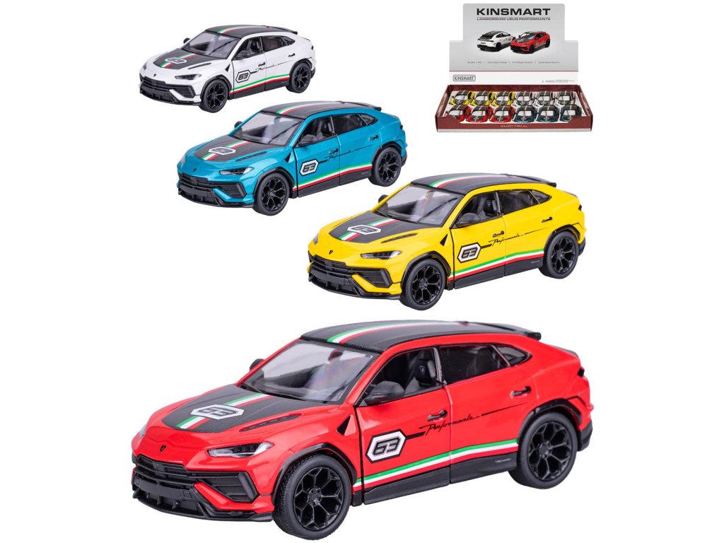 KINSMART KT5447F: Lamborghini Urus Performante - Věrný kovový model auta (detailní kopie) z kovu a plastu, zpětný chod, 4 barvy. Má otevírací dveře (dvířka jdou otevírat). Auto vyrobeno tlakovým litím z kovové slitiny v kombinaci s plastovými díly.