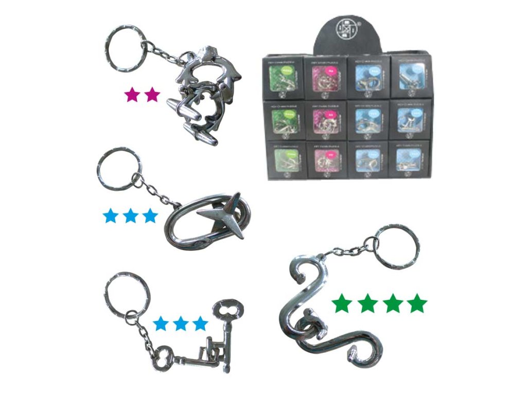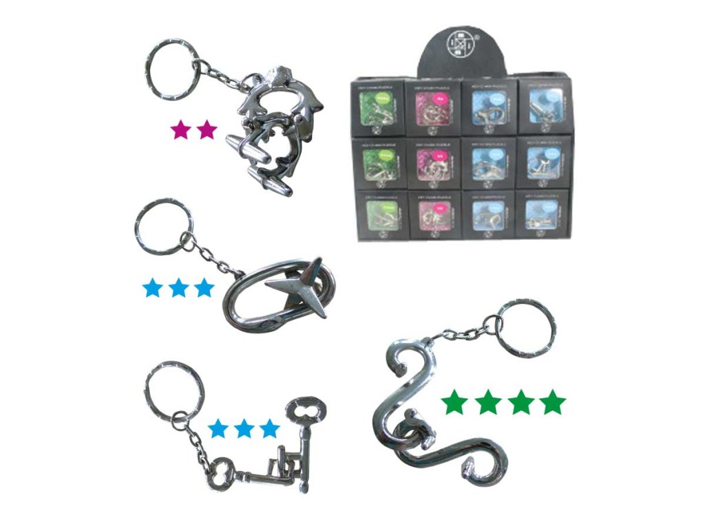 Malé kovové hlavolamy - s přívěskem na klíče. Výběr ze čtyř druhů zábavných hlavolamů. Ideální dárek pro hloubavé kamarády či rodinné příslušníky, nebo velmi originální klíčenka. Dle obrázku mají hlavolamy různou obtížnost. Obtížnost se zvyšuje počtem hvězdiček u fotky hlavolamu. - Materiál: kov. - Velikost obalu: 75x75 mm - Do poznámky uveďte o jaký druh máte zájem - Uvedená cena je za kus