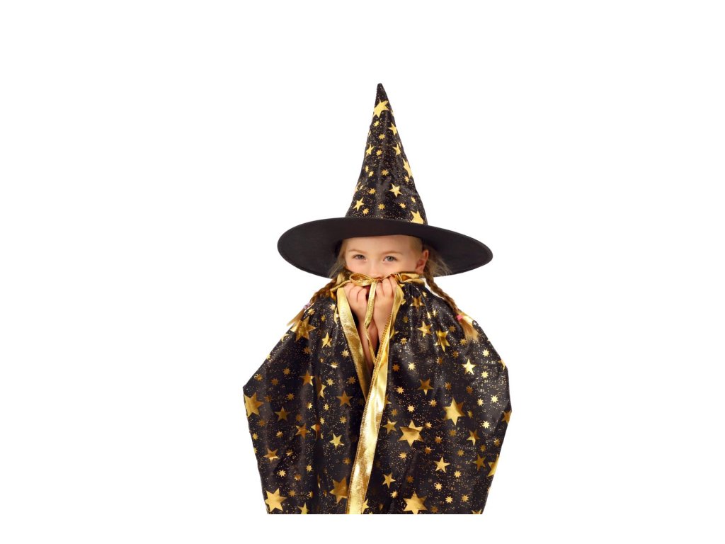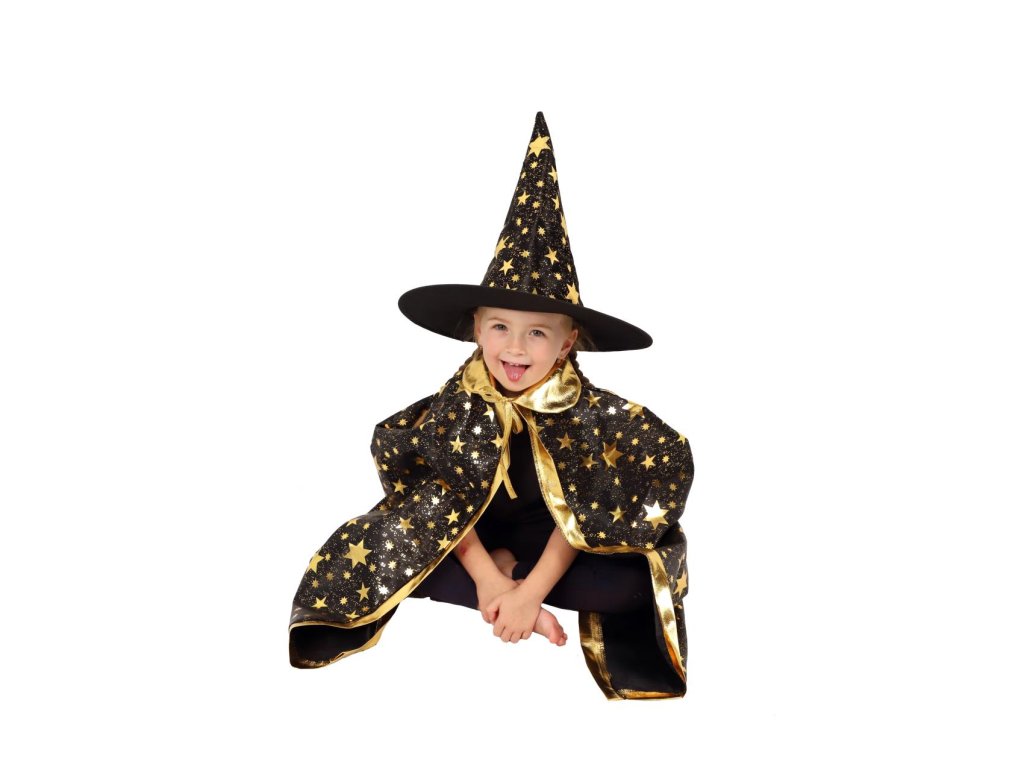 Dětský čarodějnický klobouk a plášť jsou inspirovány světem kouzel a magie. Mají černou barvu a jsou zdobené zlatými hvězdami, které vzbuzují čarodějnický dojem. Děti si mohou hrát na kouzelníky a kouzelnice, zkoumat svět kouzel a vytvářet své vlastní příběhy plné dobrodružství a fantazie. Čarodějnický klobouk s pláštěm jsou oblíbenou součástí karnevalových a halloweenských kostýmů.