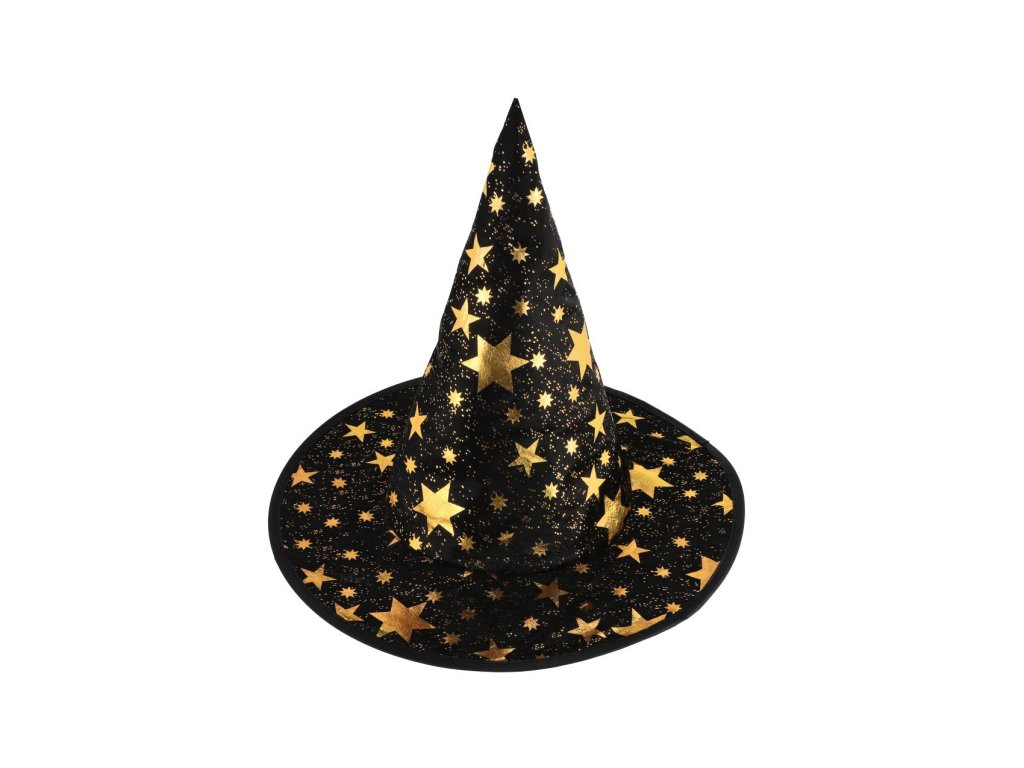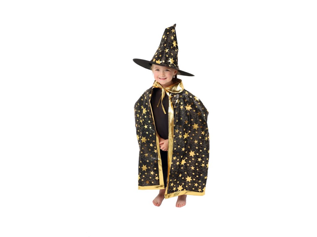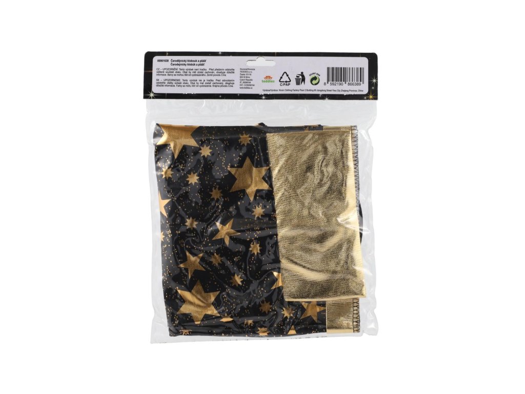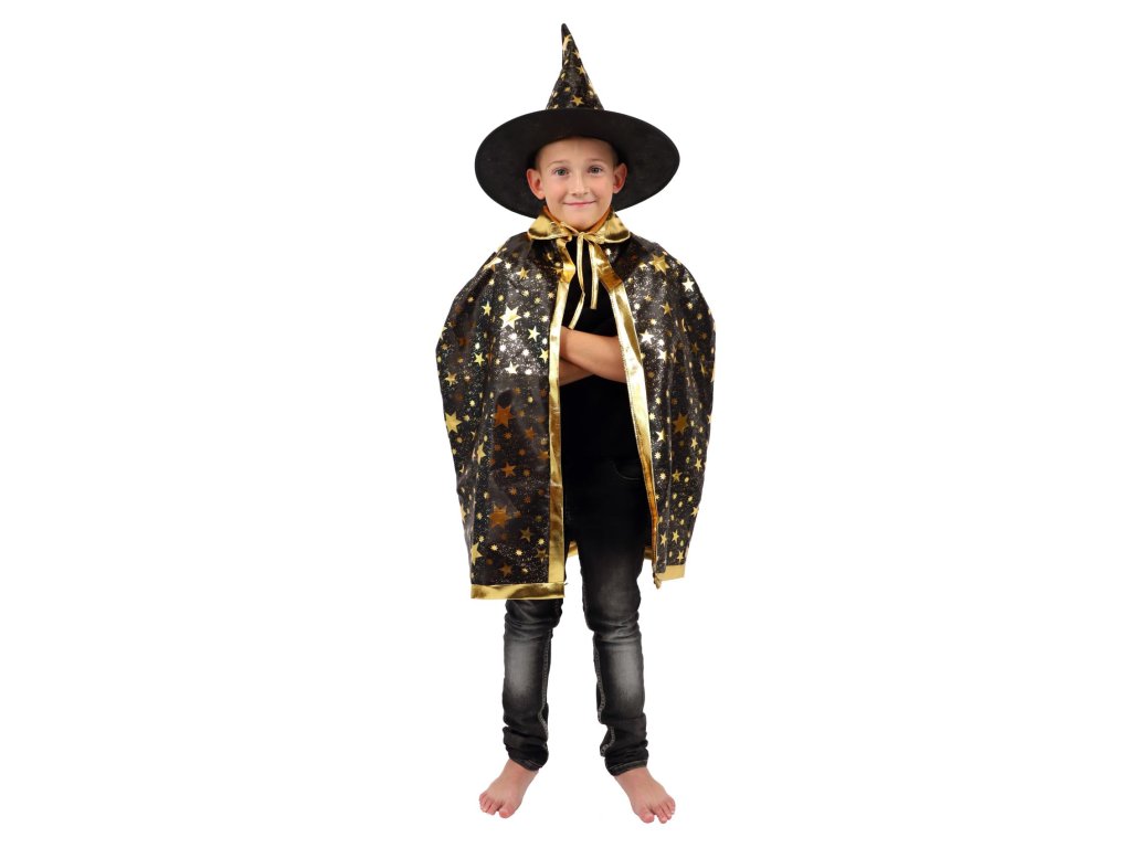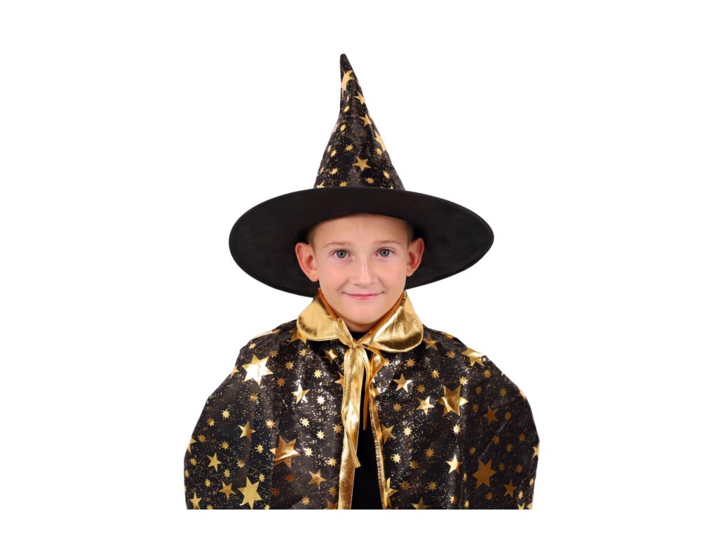 Klobouk čarodějnický + plášť pro děti průměr 38cm černo-zlatý v sáčku karneval