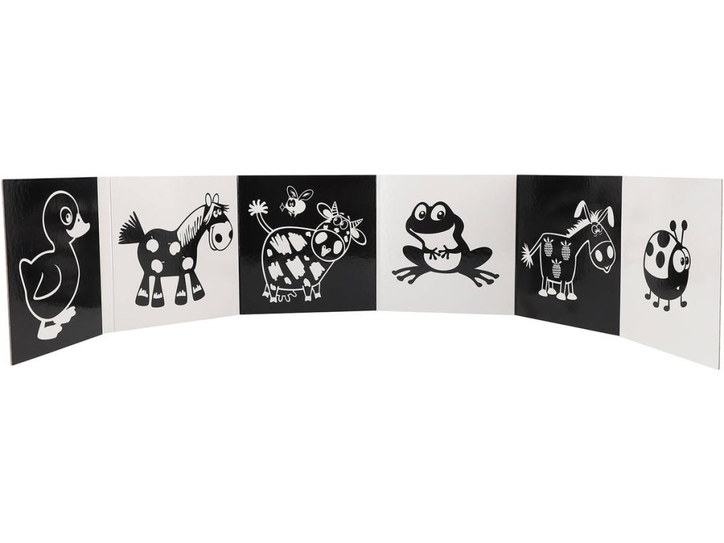 Baby knížka černobílé kontrastní leporelo na téma Zvířátka. Rozkládací knížečka pro nejmenší děti, pro miminko.