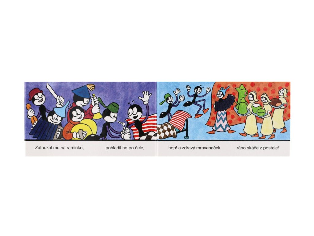 Klasické leporelo o malém mravenečkovi s ilustracemi Ondřeje Sekory. Dnes už klasické leporelo vypráví příběh o malém mravenečkovi, který je celý polámaný. Přijde ho léčit mravenčí doktor, ale nakonec mu pomůže přátelské pohlazení jeho kamaráda . Srozumitelné, přehledné a hravé leporelo nakreslil známý tvůrce Ferdy Mravence Ondřej Sekora.