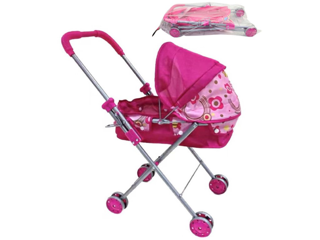 Skládací dětský růžový kočárek pro panenku - miminko. Kovová konstrukce, dodáváno v rozloženém stavu, v sáčku.