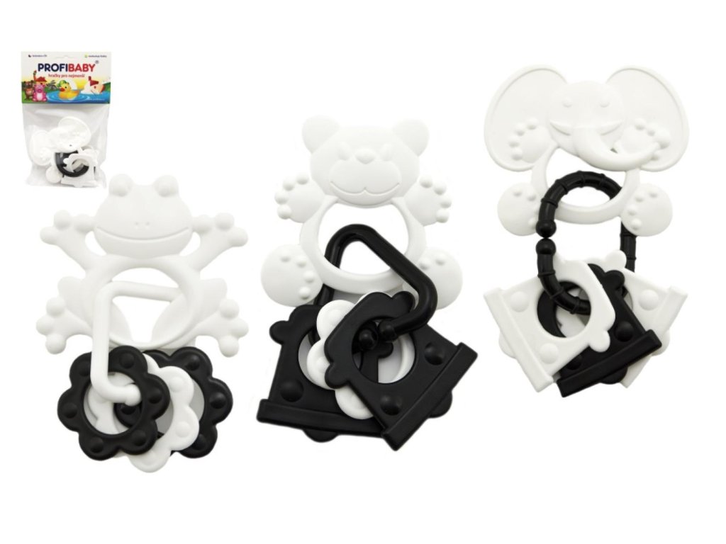 Kousátka zvířátka + přívěsky plast černobílé 9cm 4 druhy v sáčku 0m+