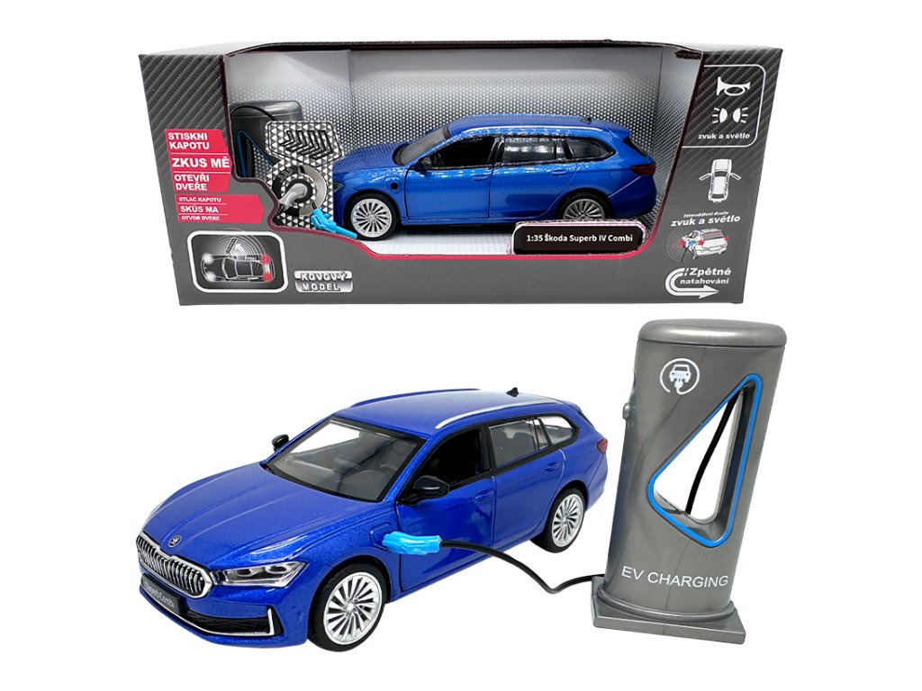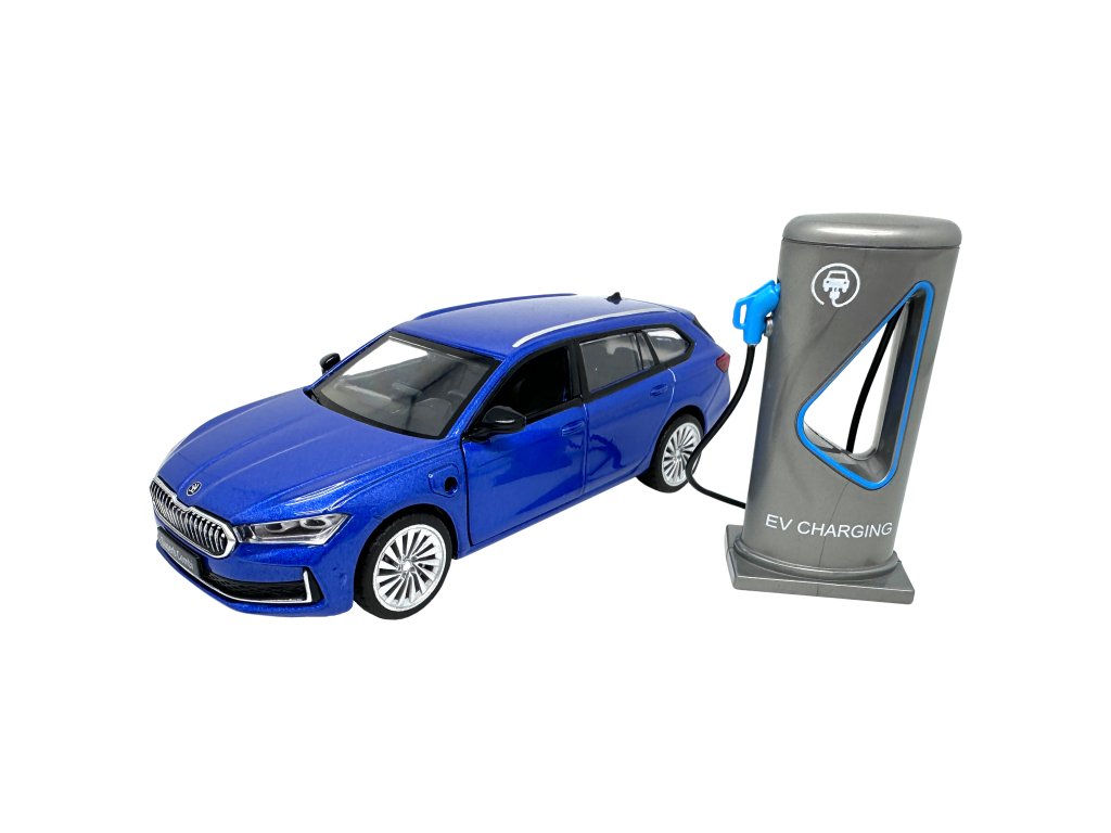 Kovový model - 1:35 Škoda Superb IV Combi modré + nabíjecí stanice