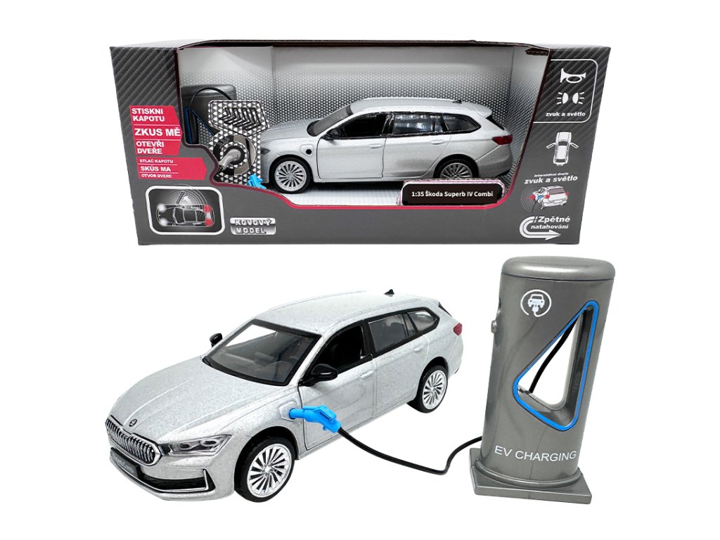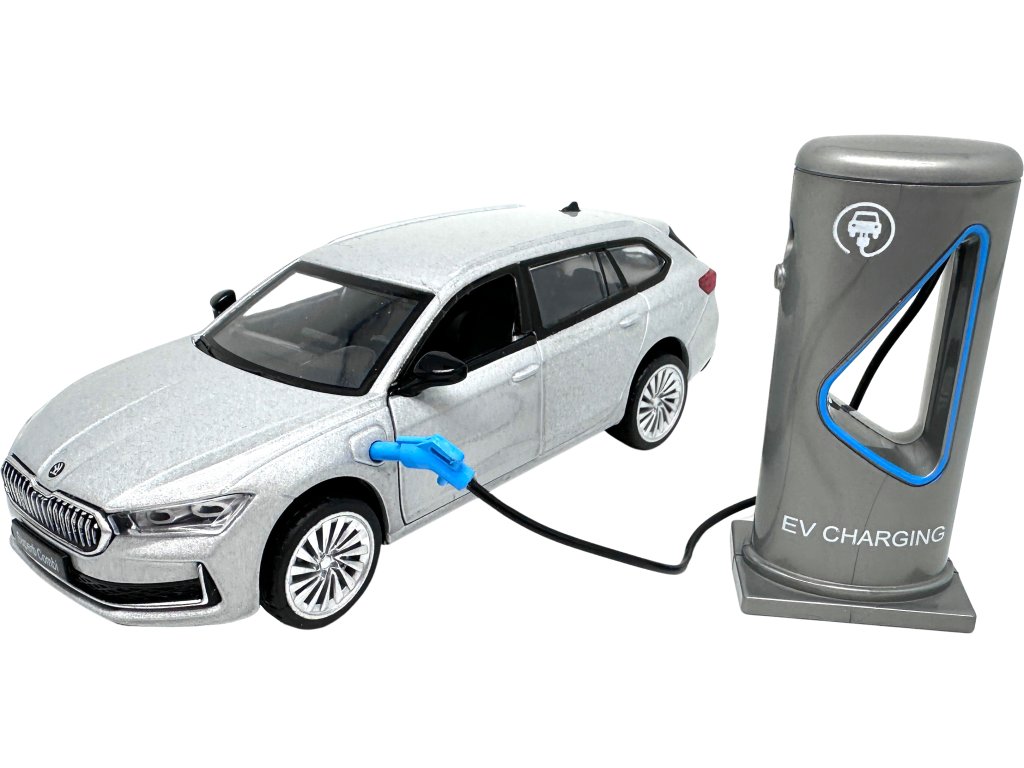 Kovový model - 1:35 Škoda Superb IV Combi Stříbrně šedá + nabíjecí stanice