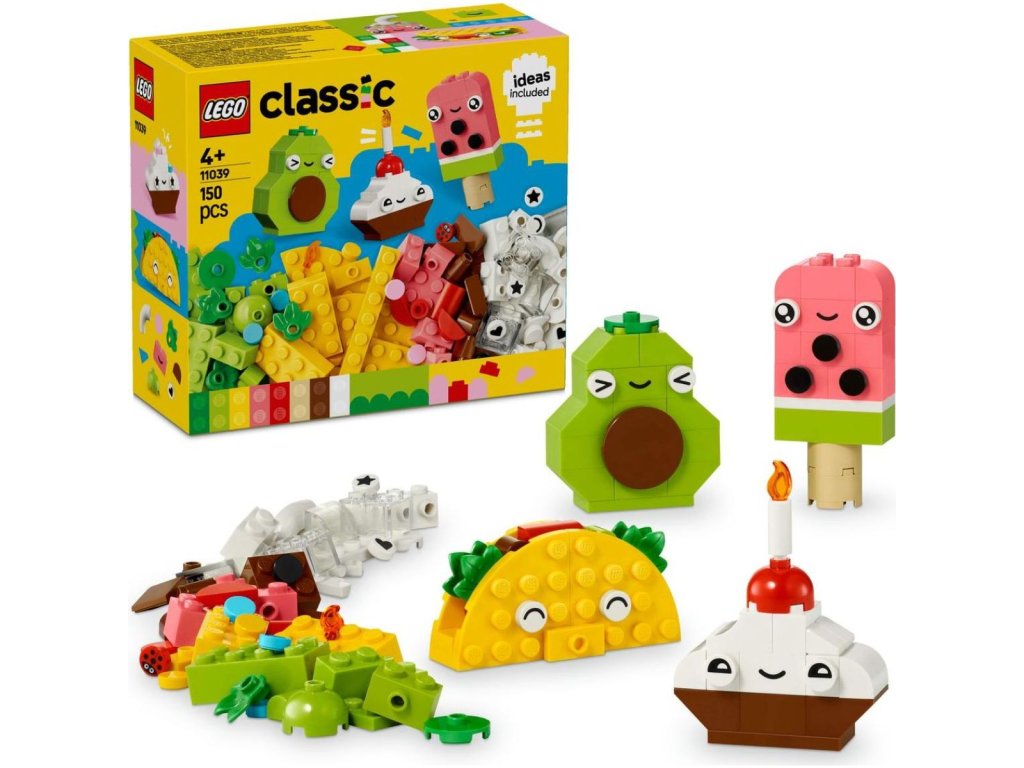Všestranná stavebnice LEGO® Classic (11039) Kreativní jídlo je ideální pro děti od 4 let. S touto nápaditou hračkou si děti postaví řadu zábavných postaviček z jídla a užijí si celé hodiny hraní. Díky nekonečným možnostem zábavného stavění, přestavování a objevování tato stavebnice LEGO pro začínající stavitele pomáhá rozvíjet sebevědomí, soustředění a schopnost řešit problémy. Děti si pomocí pestrobarevných a poutavých kostek a speciálních dílků, jako jsou oči, ústa a řada dekorativních prvků, postaví 4 roztomilé hračky ze stavebnice Kreativní jídlo: Cupcake, zmrzlinu, avokádo a taco. Kreativní zábava bude pokračovat, když děti kostky promíchají a přestaví modely na dort s posypem, bubble tea, hrušku a panini. Až děti získají větší sebevědomí při stavění, mohou podle intuitivního návodu na stavění měnit jejich výrazy, tvary nebo barvy a poskládat si nové kamarády: Zelenou zmrzlinu, krabici džusu, kousek melounu, čokoládovou tyčinku a mega sendvič.