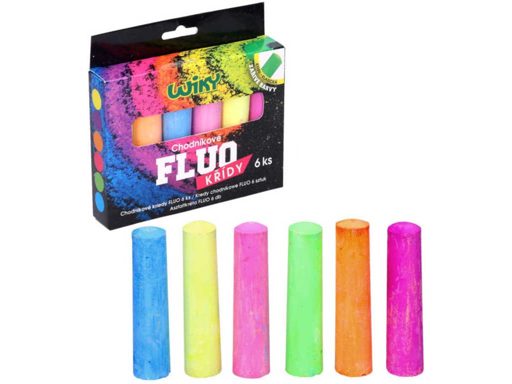 Chodníkové kulaté křídy FLUO v balení po 6ti kusech v jasných barvách, s klasickým hrotem, v papírové krabičce.