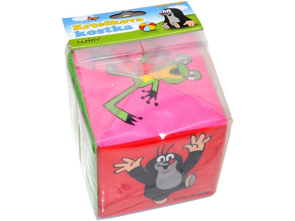 Vhodné pro děti od narození. Textilní kostka má uvnitř rolničku, je měkoučká a pěkně barevná. Každá stěna kostky má jinou barvu a je na ní zobrazena pokaždé jiná postavička, buď samotného Krtečka, nebo jeho kamarádů.