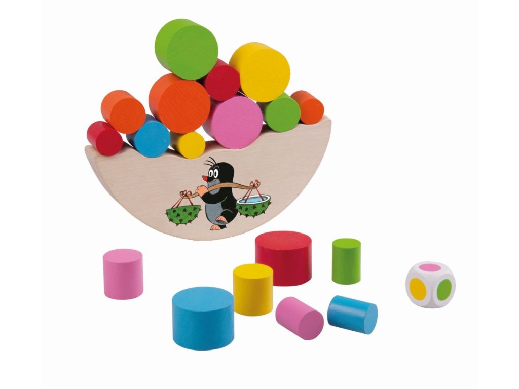 Balanční hračka Krtku nerozlij to! Vhodné pro děti od 4 let. Hra slouží k rozvoji jemné motoriky dítěte. Výrobek je zdravotně nezávadný. Hra je určená pro 2 - 6 hráčů. Vždy začíná nejmladší hráč. Hodí kostkou, vybere váleček barvy, která mu padla, a vloží váleček libovolně na vršek dřevěného dílku. Hra pokračuje, dokud se válečky nerozsypou nebo se dílek s Krtkem nepřevrátí.