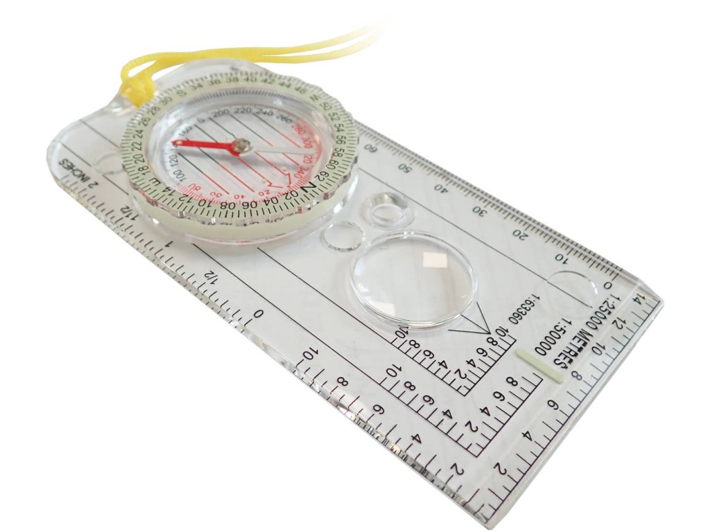 Speciální buzola s měřítkem, průhledná destička, rozměry 12,5 x 6cm, ideální na turistiku nebo orientační běh.