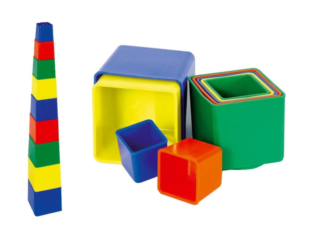 Kubus pyramida skládanka hranatá plast 4 barvy 9ks v sáčku 9x9x9cm 12m+