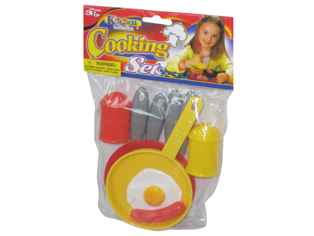 - Sada plastového nádobí na vaření. - Skvělá hračka pro malé hospodyňky! - Na toto nádobí je možné pokládat a vkládat potraviny. - Set obsahuje: pánvičku, talířek, talíř, pepřenku, slánku, naběračku, obracečku, podběračku, lžíci, párek a ""volské"" oko. - Hračka je vyrobená z vysoce kvalitního plastu.