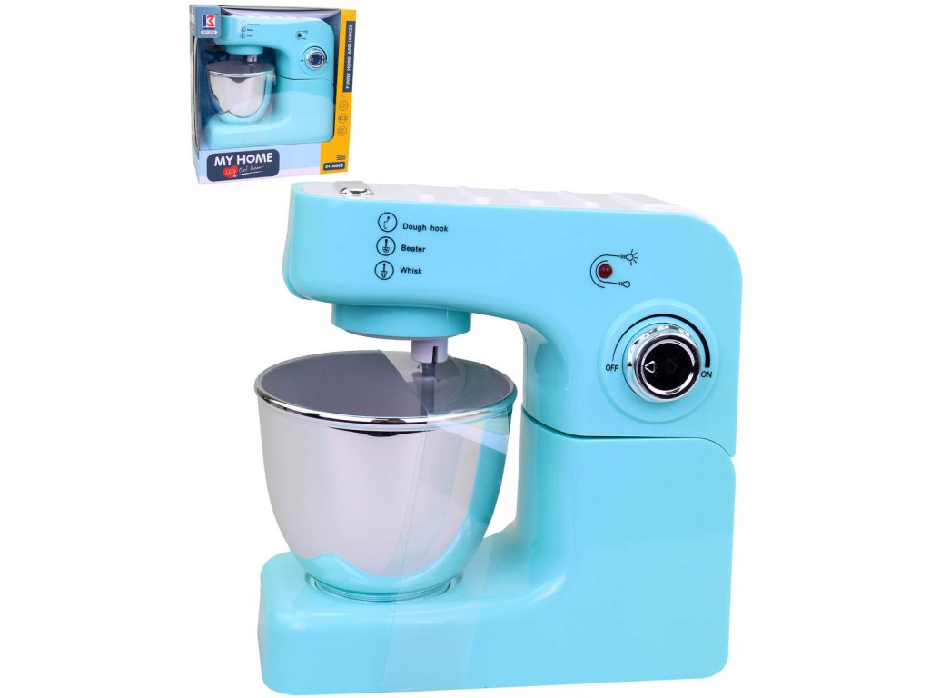 Dětský modrý kuchyňský funkční robot hnětač a šlehač o velikosti 19cm. Metličky se otáčí, vrchní díl lze vyklopit, součástí 3 různé nástavce. Hračka na baterie, se světlem a zvukem, pro všechny malé kuchaře a pomocníky v kuchyni.