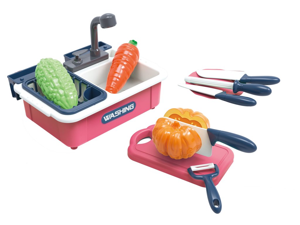 Kuchyňský set. Rozměry dřezu 19x13,5x6 cm. Dřez, odkapávač, 3 nože, brousítko nožů, krájecí prkénko, škrabka, rozkrojitelná mrkev, kukuřice, dýně.