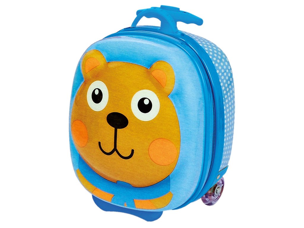 Menší, barevný kufřík s kolečky, motiv medvěd, vyrobený z ethylenvinylacetátu, proto je velmi odolný. S výsuvnou rukojetí a kolečky z pevného plastu. Pro všechny věci na přenocování u babičky a dědy nebo přáteli. Vhodné pro děti od 18 měsíců. Velikost cca 16x30x25 cm
