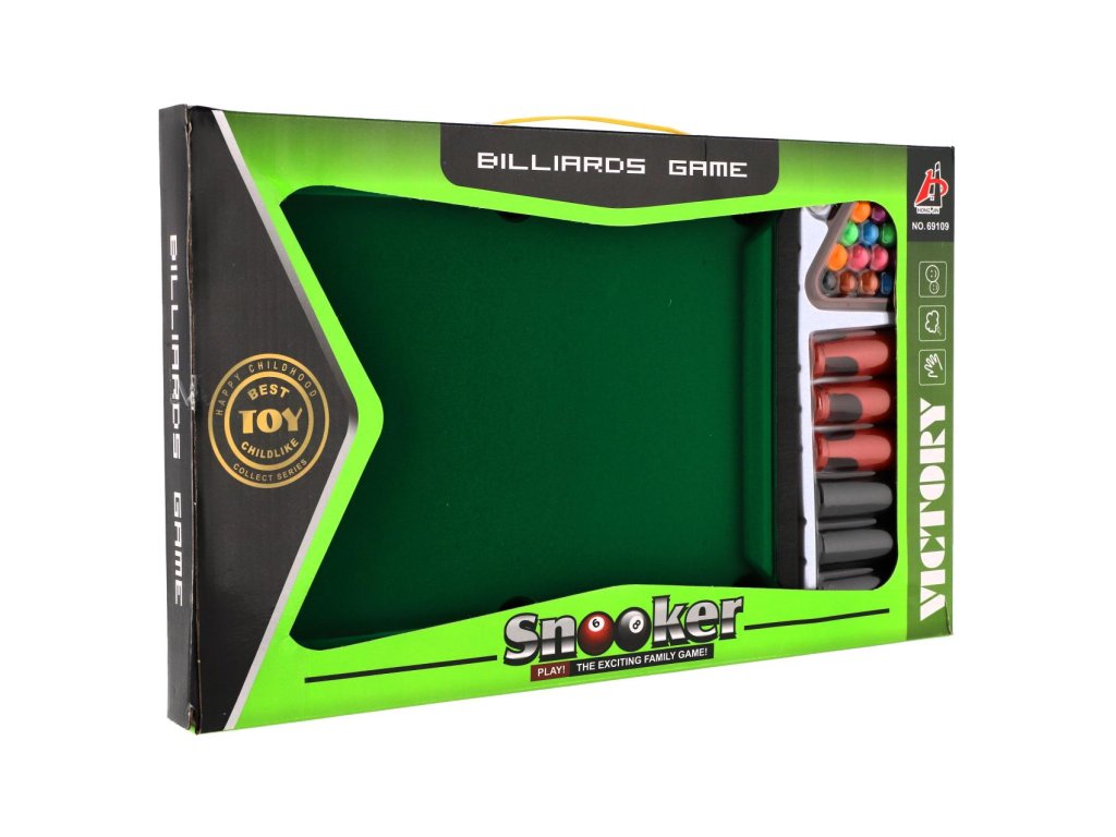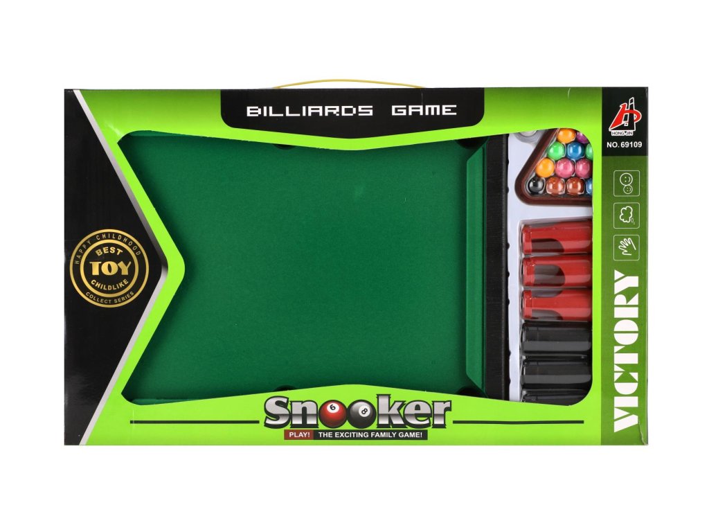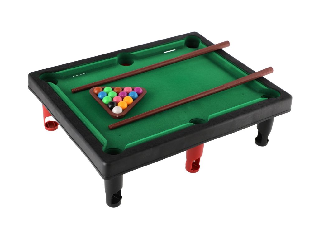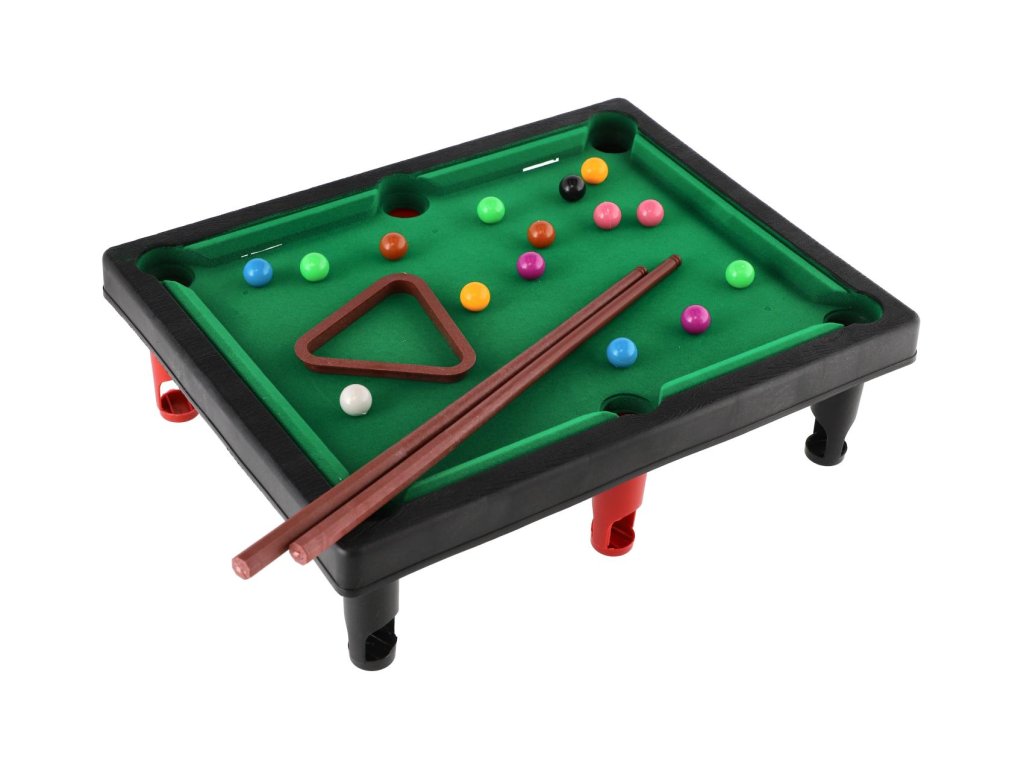 Dětský stolní kulečník je věrnou zmenšeninou klasického kulečníku. Stačí hru položit na stůl nebo jakoukoliv jinou rovnou plochu a hra může začít! Nechybí ani triangl pro srovnání koulí. Tento malý kulečníkový stůl je určen pro zábavu a trénuje motoriku a koordinaci rukou a očí. Velikost složeného kulečníku 33 x 26 x 10 cm.