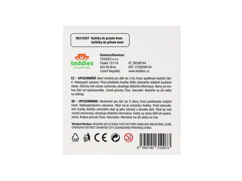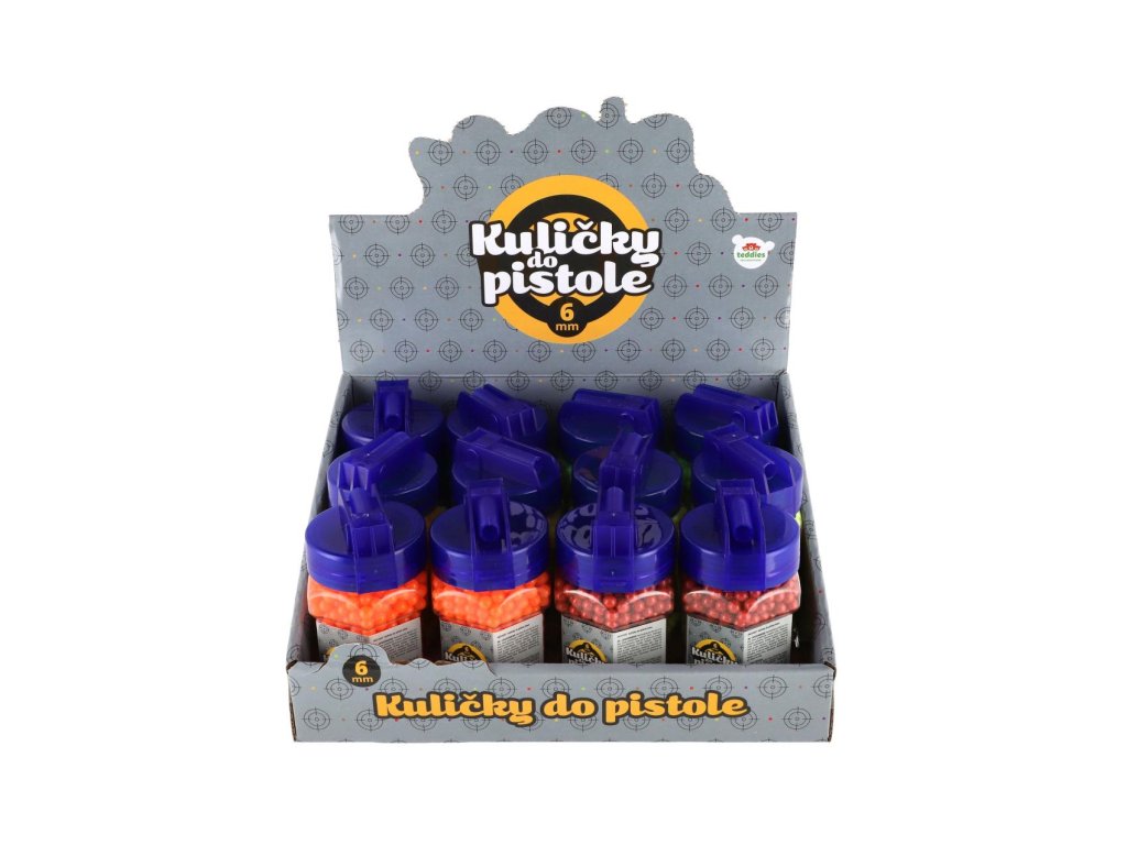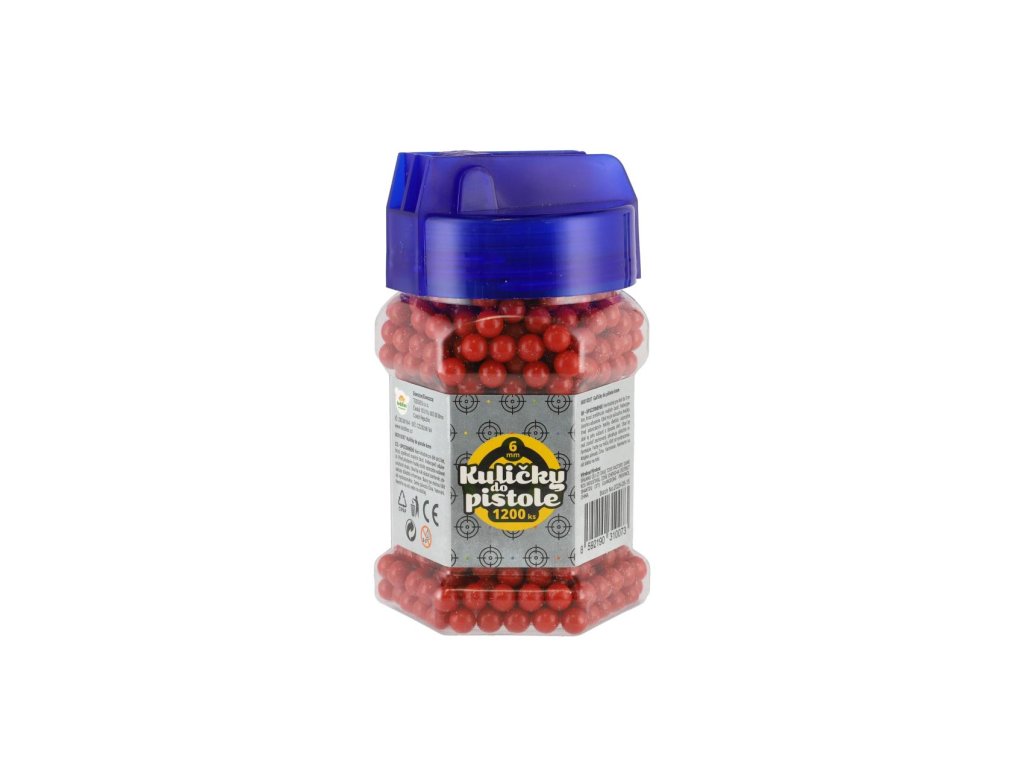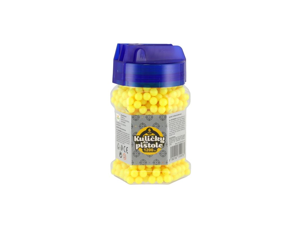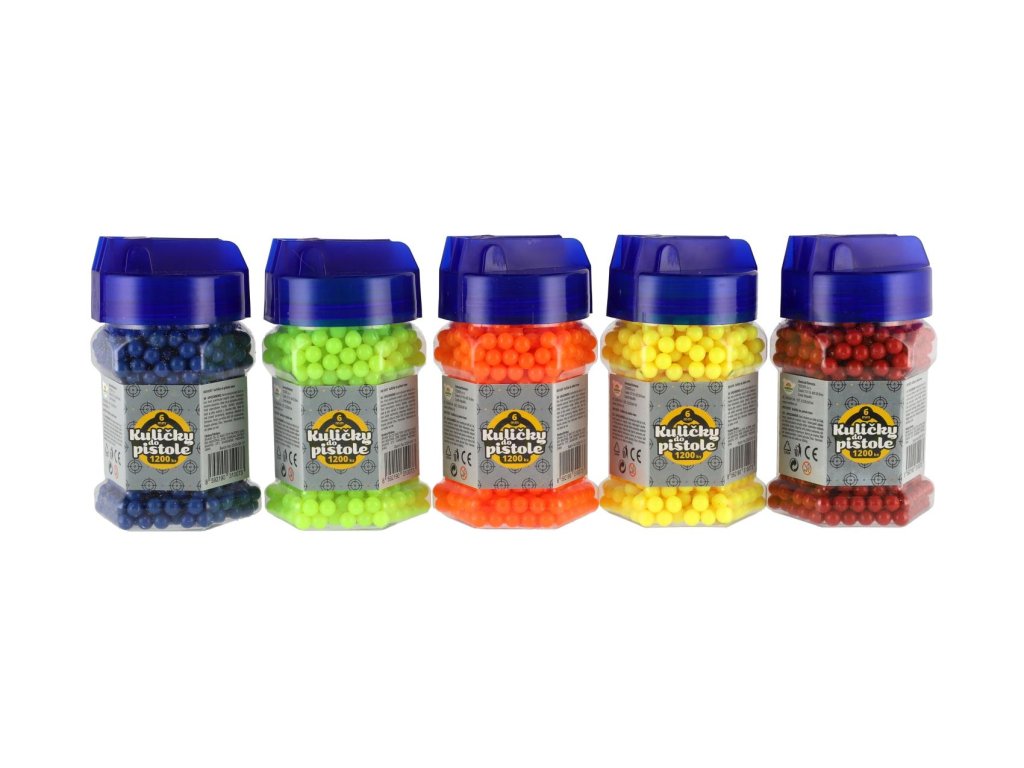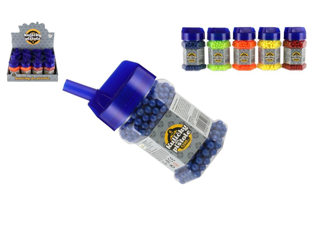 Náhradní plastové kuličky do pistolí pro dětské střelce a zábavné soutěže ve střelbě na cíl. Balení obsahuje 1200 kusů kuliček o průměru 6 mm, které jsou lehké a vhodné pro běžné hračkářské pistole. Díky praktické lahvičce s uzávěrem se kuličky snadno skladují a dávkují. K dostání v několika barevných variantách.