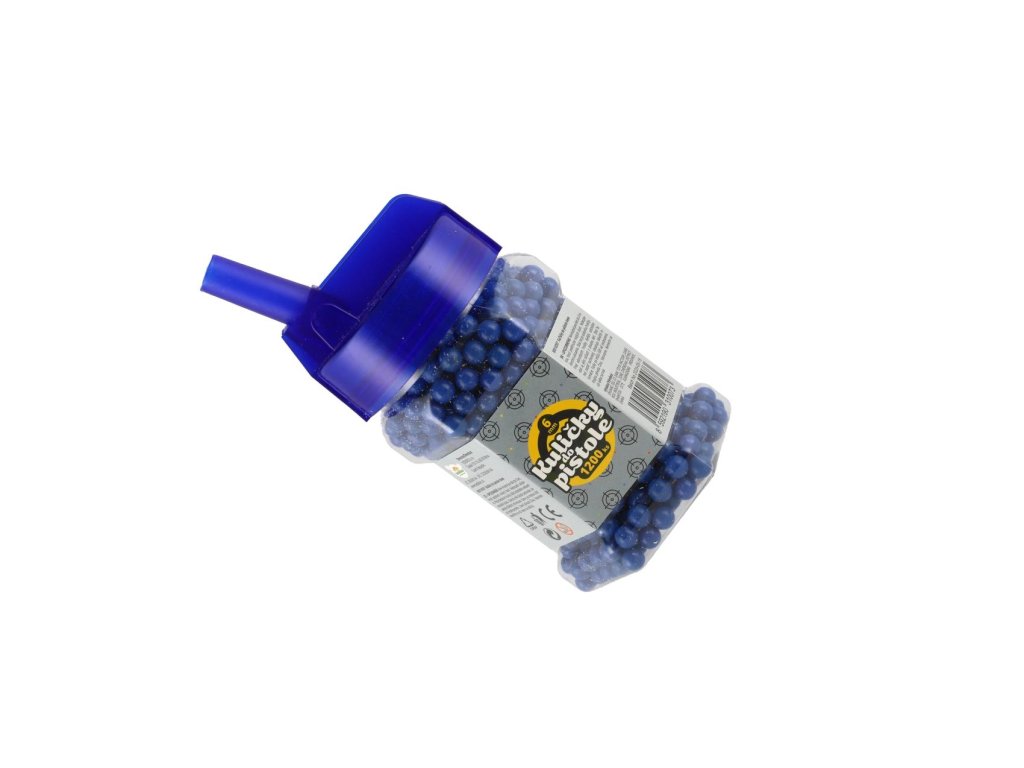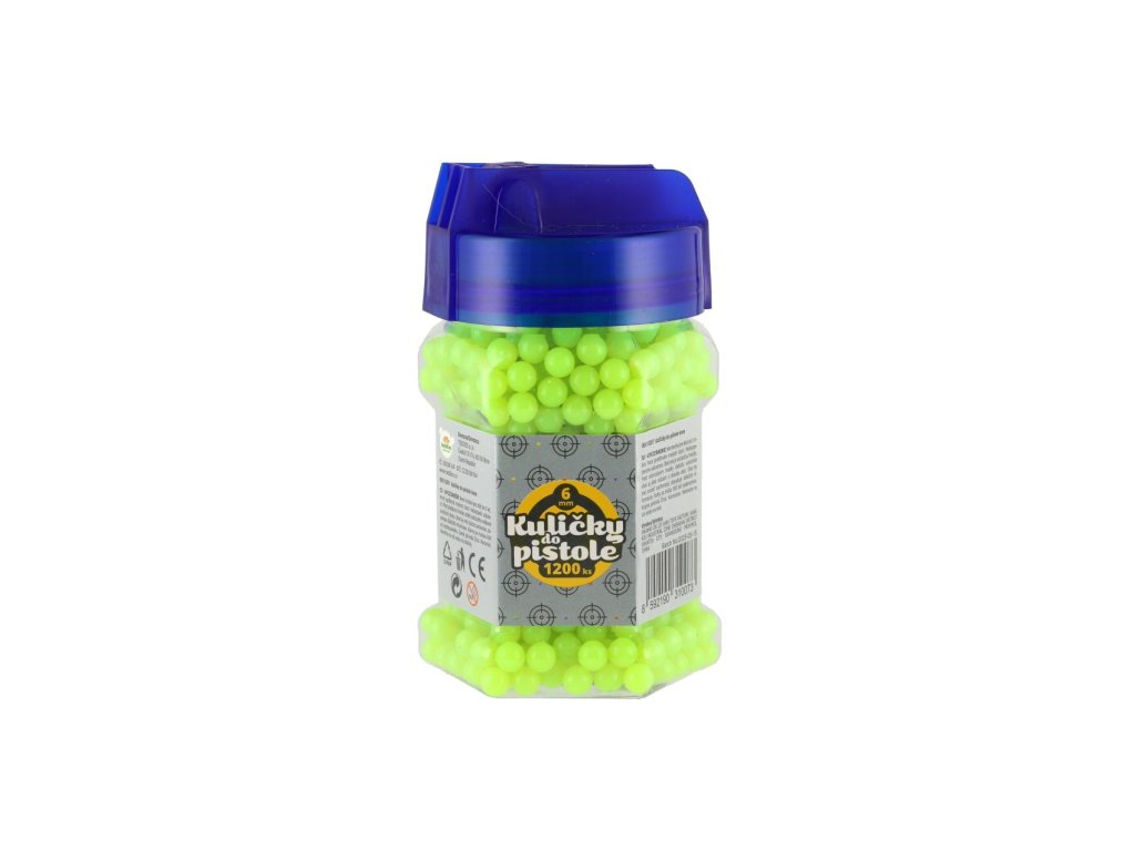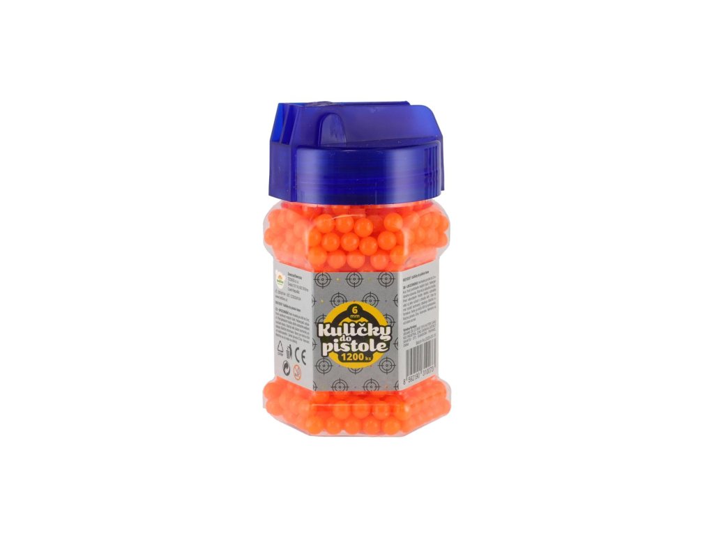 Náhradní plastové kuličky do pistolí pro dětské střelce a zábavné soutěže ve střelbě na cíl. Balení obsahuje 1200 kusů kuliček o průměru 6 mm, které jsou lehké a vhodné pro běžné hračkářské pistole. Díky praktické lahvičce s uzávěrem se kuličky snadno skladují a dávkují. K dostání v několika barevných variantách.