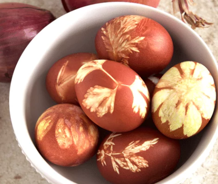 - Žlutá cibule: Vložte slupky z dvou žlutých cibulí do vody a nechte vařit s vajíčky. Hlídejte délku barvení, aby nebyla příliš intenzivní.