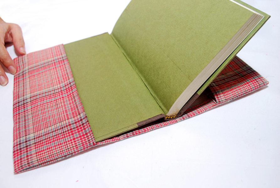 Složení a sešití: Položte knihu na střed obálky a složte ji tak, aby byla obálka na knize symetrická. Sešijte boční hrany obálky tak, aby držela pevně na knize.