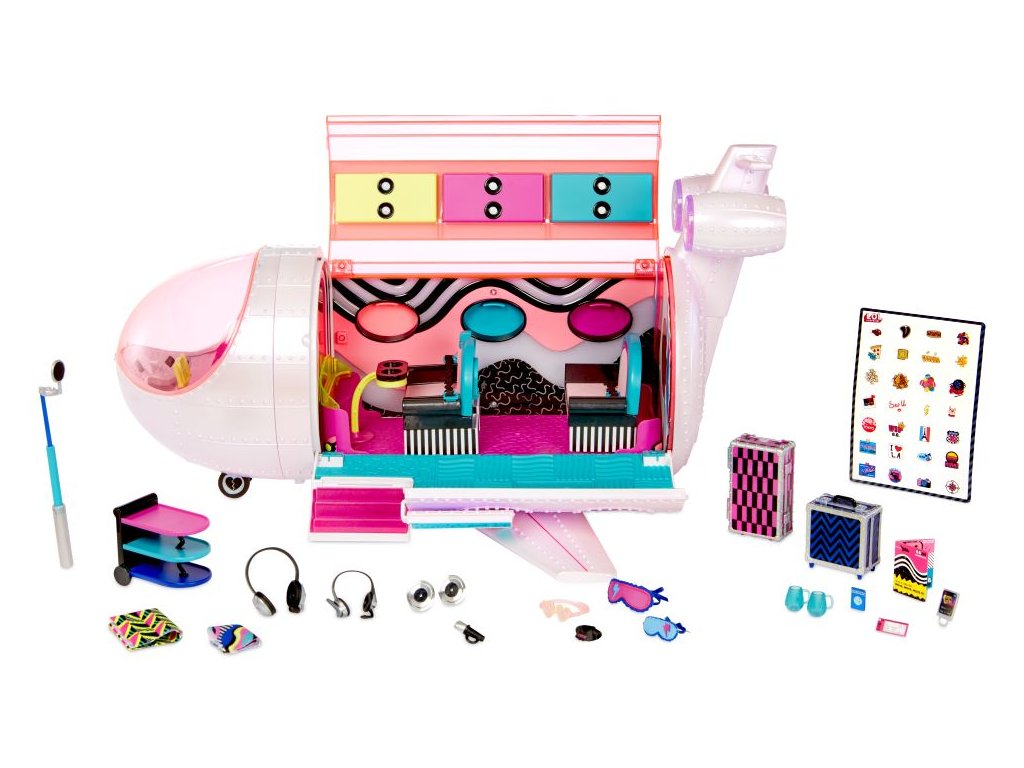 V OMG Letadle se proletí OMG Velké ségry i L.O.L. panenky! Letadlo využiješ čtyřmi různými způsoby. Můžeš ho použít jako letadlo, jako vozidlo, jako nahrávací studio nebo jako mixážní kokpit pro mistryni zvuku. Rozbal více než 50 překvapení včetně jídelních táců s talíři a kelímky, kufříků na kolečkách a dalších doplňků. Letadlo svítí, má funkční přihrádky nad hlavou, bezpečnostní pásy, polohovatelná sedadla, odnímatelnou kabinu pilota a spoustu dalších vychytávek.