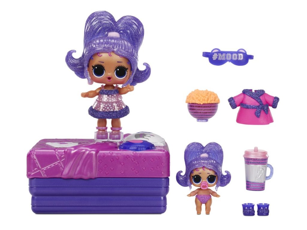 V luxusním dárkovém balení s velkou mašlí najdeš L.O.L. panenku a sestřičku z limitované edice inspirované pyžamovou párty. Panenky jsou ukryté v plastové krabičce ve tvaru postýlky, která se může použít k vystavení postaviček nebo jako pouzdro na přenášení. Balení obsahuje také dvě úžasné paruky a další doplňky ve třech kosmetických flakonech ve tvaru laku na nehty. Párty dárek Deluxe je ideální k narozeninám nebo jiným příležitostem. L.O.L. panenka mění barvu v teplé vodě a malá sestřička v ledové vodě.