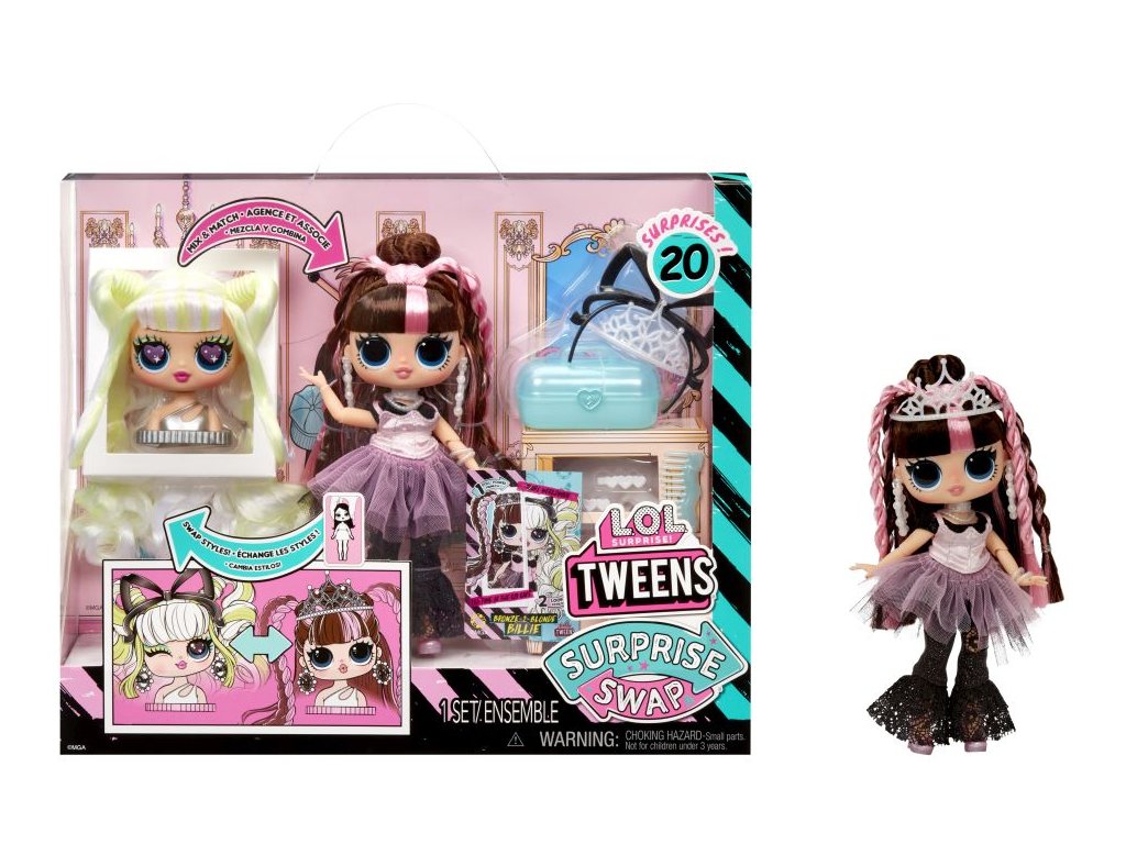 Získej 4 nové divoké a stylové Tweens panenky. V balení s panenkou najdeš mini česací hlavu a různé vlasové doplňky, díky kterým vykouzlíš dokonalý účes. Panence můžeš vyměnit hlavu podle toho, jaký styl se bude hodit k jejímu outfitu. Česací hlava má jiný výraz tváře, jinak barevné a jinak upravené vlasy. Můžeš kombinovat mezi všemi Swap Tweens panenkami.