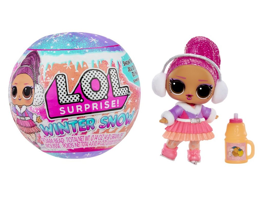 Rozbal jednu z osmi oblíbených L.O.L. panenek v zimním outfitu. Panenky mají ve vlasech třpytky, a pokud dáš panence napít, můžeš sledovat, jak se třpytky ve vlasech hýbou a usazují. Polovina balení obsahuje kinetický písek, ve kterém jsou ukryté doplňky, a v průhledné kouli písek vypadá jako sníh.