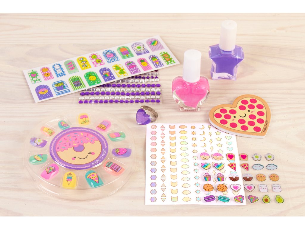 Laky na nehty se zdobením. Obsahuje: 2 barvy laku na nehty, spousta nálepek a ozdob na nehty, instrukce. Laky na nehty jsou na vodní bázi a lze je odstranit jemným třením teplou vodou a mýdlem.