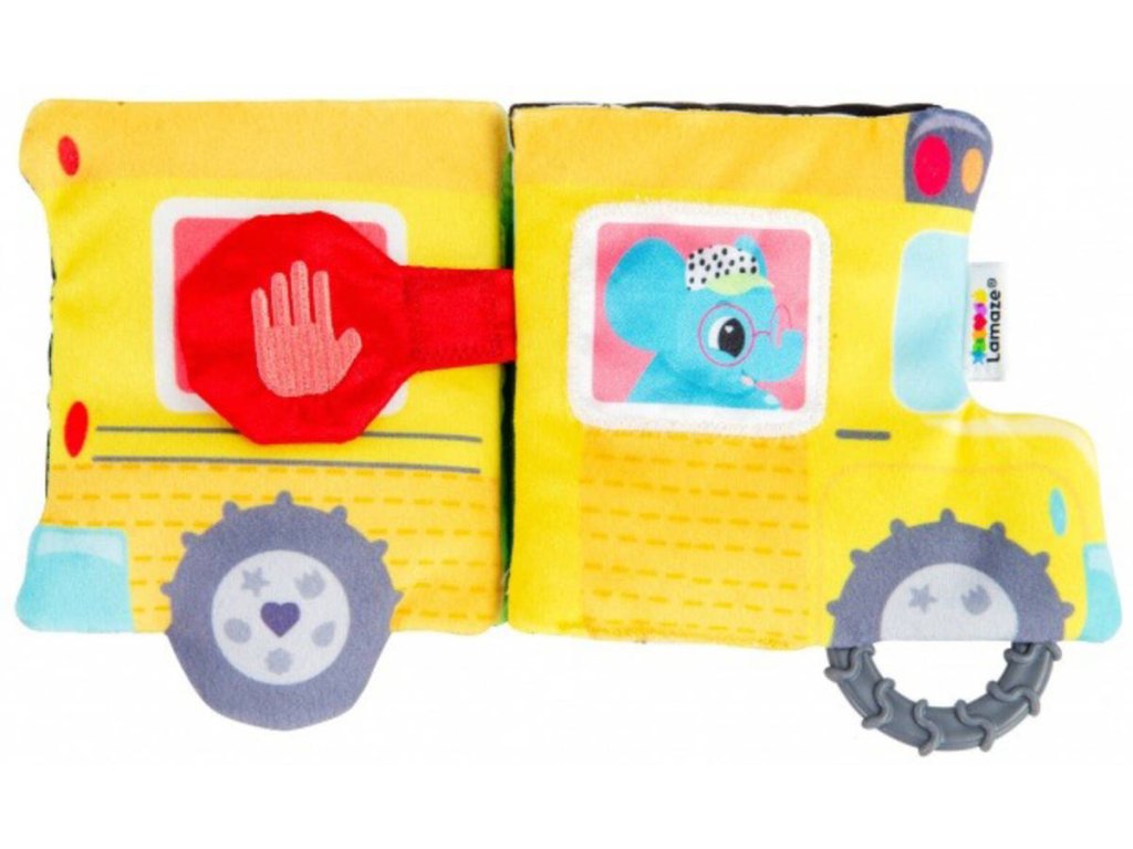 Multifunkční textilní rozkládací leporelo knížečka autobus od Lamaze, pro nejmenší děti, pro miminko. Obsahuje kousátko a zrcátko. Šustí, píská.