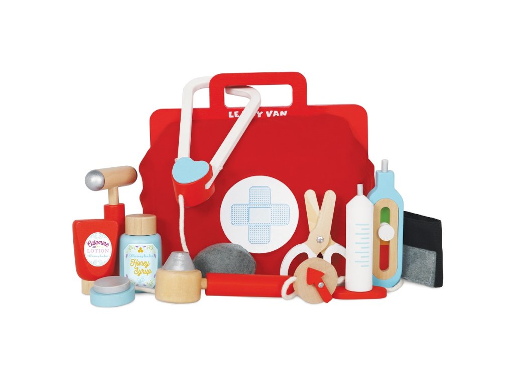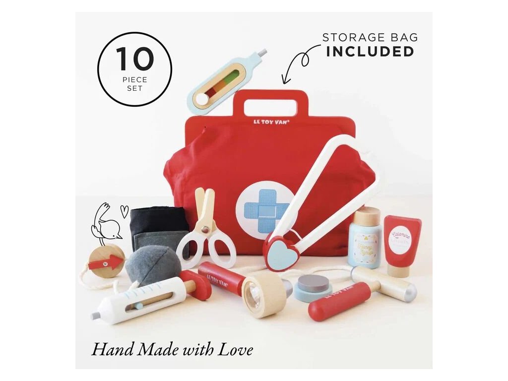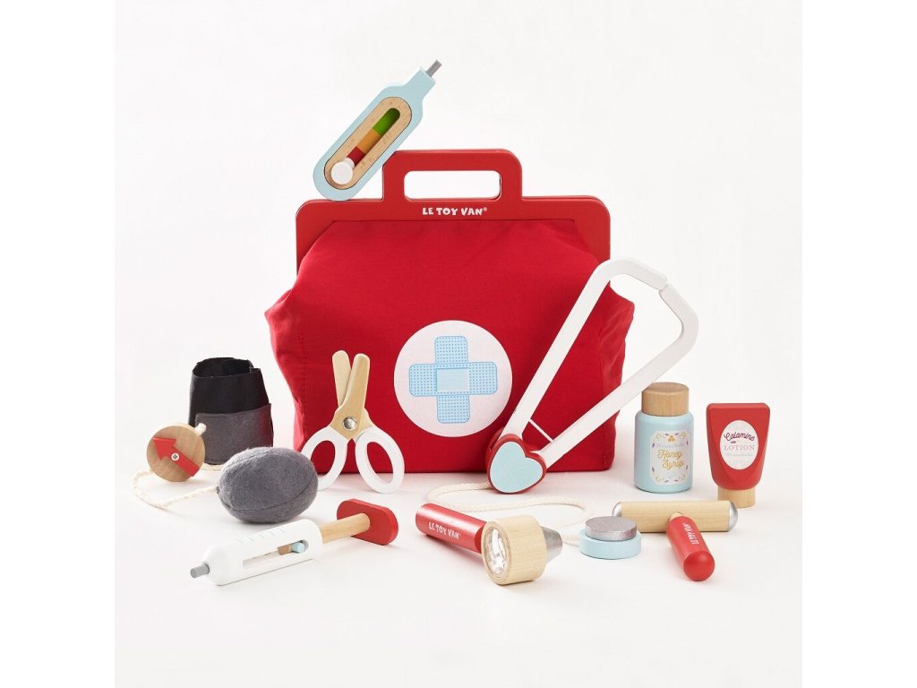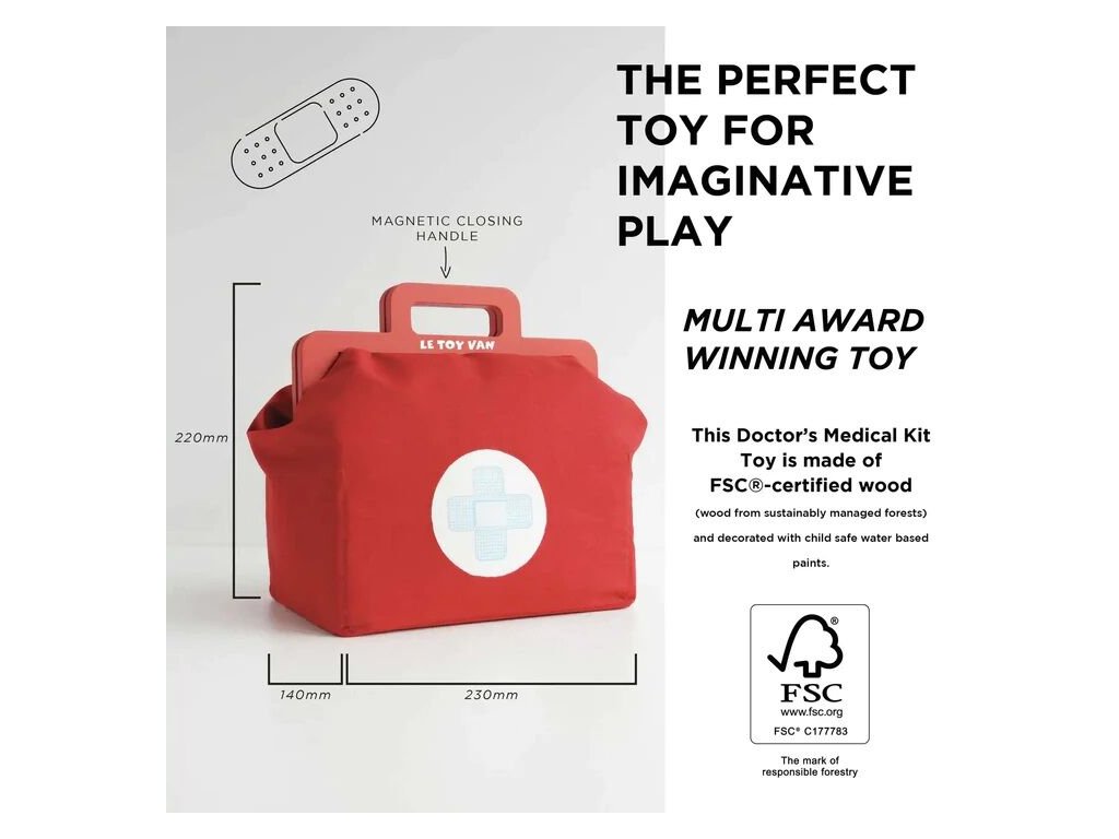 Sada pro mladé lékařky, záchranáře a zdravotní sestry! Genderově neutrální hračka pomůže s rozvojem jemné motoriky a zručnosti. Skládá se z vintage textilní brašny s dřevěnými uchy a pevným dnem a 9 doplňků, mezi které patří stetoskop, teploměr, injekční stříkačka, nůžky, mast a další. Hra na role nikdy nebyla zábavnější! Dětem můžete vytisknout a vystřihnout speciální kartičky s „lékařským předpisem“. Hračky s účelemVšechny hračky firmy Le Toy Van jsou vyrobeny s cílem – aby dlouho vydržely. Designovány s láskou zkušenými řemeslníky za použití etických praktik a udržitelných materiálů, které jsou laskavější k naší planetě. Hlavní vlastnosti: vyrobeno eticky z udržitelného dřevatestováno dle nejpřísnějších standardůmalováno netoxickými barvami na bázi vodyinspiruje k představivé hřerozvíjí kognitivní dovednosti Ocenění hračky:Dr. Toys Best Classic Award 2016Slow Toy Award 2014Junior Design Highly Commended Award 2014Made For Mums Gold Award 2018Good Toy Guide RecommendedV roce 2016 byla doporučena skupinou Experts at Fundamentally Children. Honeybake kolekce: Hračky v této kolekci jsou vhodné k objevování, pomohou dětem s rozvojem představivosti, sociálních a verbálních dovedností a kognitivních funkcí. Tradiční design s moderními detaily děti jistě bude bavit. Honeybake je kolekce Le Toy Van, která vyhrála nejvíce ocenění, a to za design, kvalitu, bezpečnost a také za vzdělávací a herní hodnotu. Značka a certifikát FSC® (Forest Stewardship Council) zaručuje, že dřevo, ze kterého byl produkt vyroben, nebylo vytěženo nelegálně a pochází z lesů obhospodařovaných šetrným či přírodě blízkým způsobem, ve kterém jsou dodržovány přísné environmentální a sociální požadavky. Značka FSC® na výrobku znamená, že svým nákupem pomáháte chránit lesy a podporujete šetrné, odpovědné či přírodě blízké hospodaření, díky kterému jsou naše lesy stabilnější, zdravější, mají přirozenou druhovou skladbu a lépe odolávají negativním následkům klimatických změn.