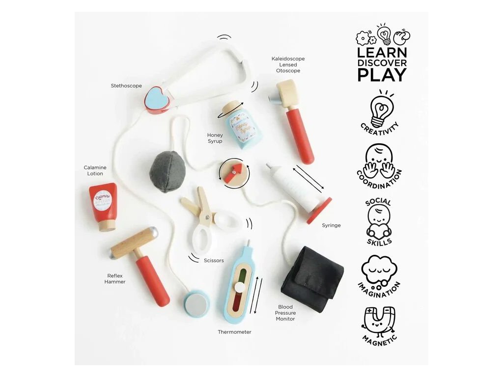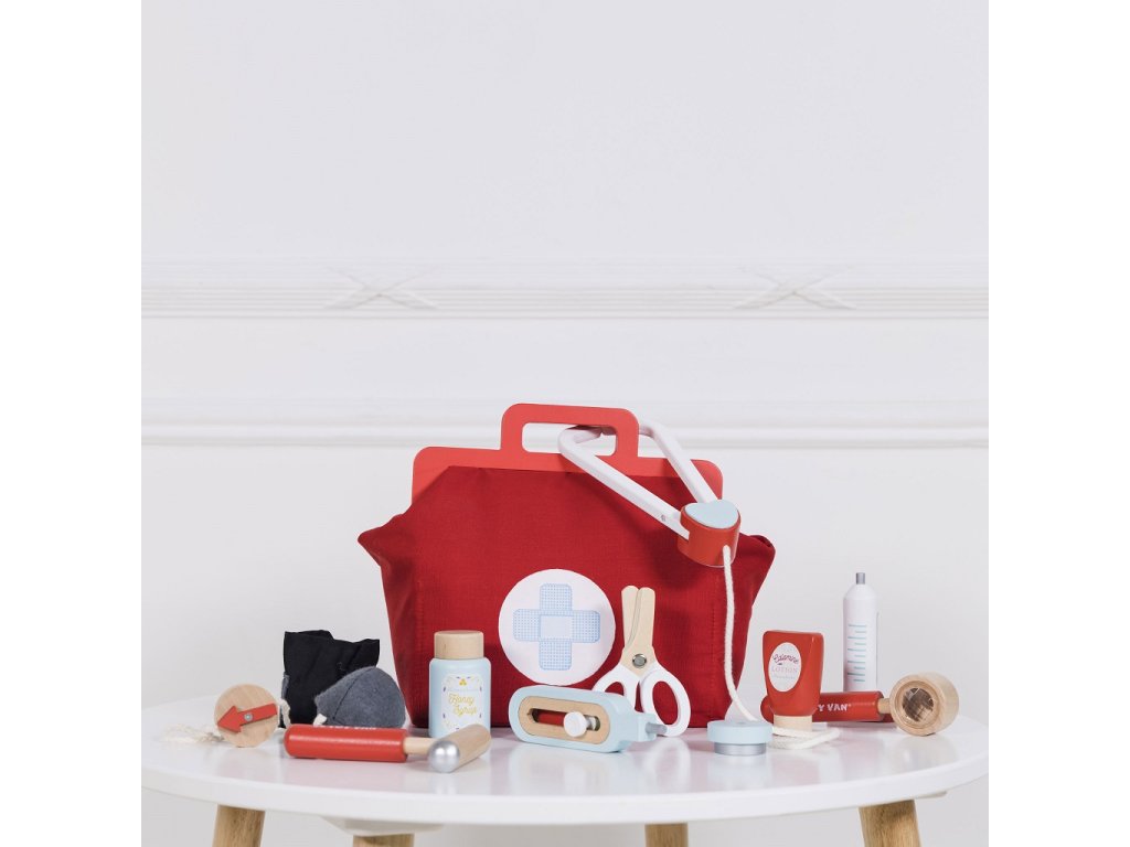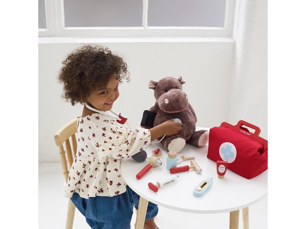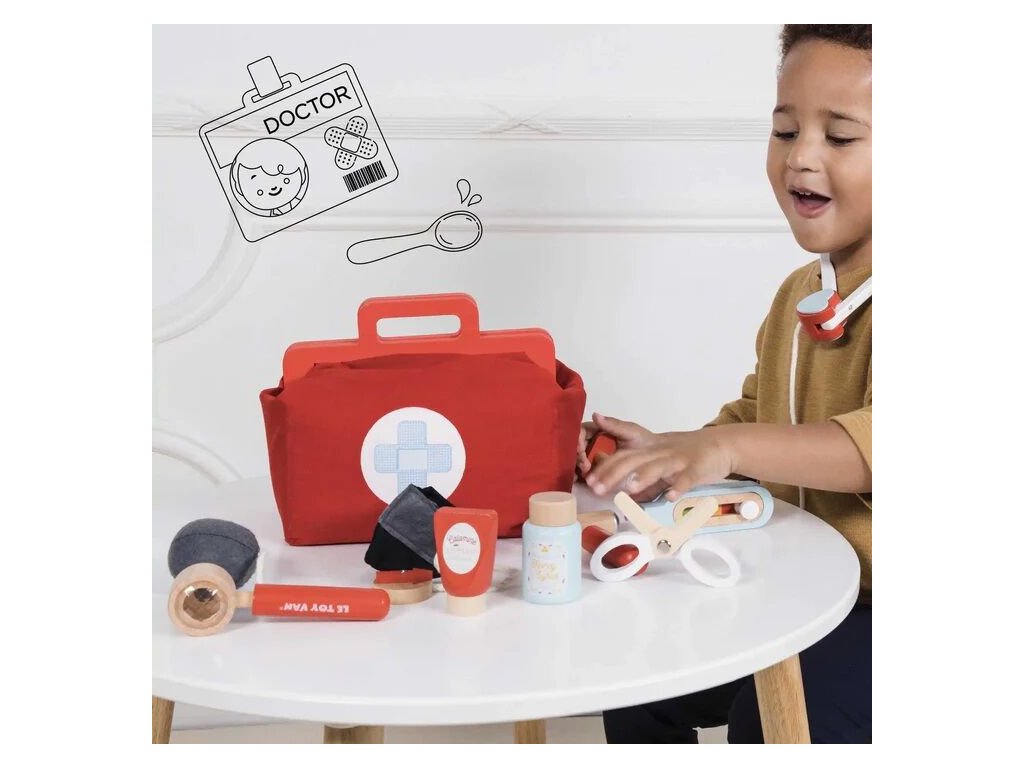 Sada pro mladé lékařky, záchranáře a zdravotní sestry! Genderově neutrální hračka pomůže s rozvojem jemné motoriky a zručnosti. Skládá se z vintage textilní brašny s dřevěnými uchy a pevným dnem a 9 doplňků, mezi které patří stetoskop, teploměr, injekční stříkačka, nůžky, mast a další. Hra na role nikdy nebyla zábavnější! Dětem můžete vytisknout a vystřihnout speciální kartičky s „lékařským předpisem“. Hračky s účelemVšechny hračky firmy Le Toy Van jsou vyrobeny s cílem – aby dlouho vydržely. Designovány s láskou zkušenými řemeslníky za použití etických praktik a udržitelných materiálů, které jsou laskavější k naší planetě. Hlavní vlastnosti: vyrobeno eticky z udržitelného dřevatestováno dle nejpřísnějších standardůmalováno netoxickými barvami na bázi vodyinspiruje k představivé hřerozvíjí kognitivní dovednosti Ocenění hračky:Dr. Toys Best Classic Award 2016Slow Toy Award 2014Junior Design Highly Commended Award 2014Made For Mums Gold Award 2018Good Toy Guide RecommendedV roce 2016 byla doporučena skupinou Experts at Fundamentally Children. Honeybake kolekce: Hračky v této kolekci jsou vhodné k objevování, pomohou dětem s rozvojem představivosti, sociálních a verbálních dovedností a kognitivních funkcí. Tradiční design s moderními detaily děti jistě bude bavit. Honeybake je kolekce Le Toy Van, která vyhrála nejvíce ocenění, a to za design, kvalitu, bezpečnost a také za vzdělávací a herní hodnotu. Značka a certifikát FSC® (Forest Stewardship Council) zaručuje, že dřevo, ze kterého byl produkt vyroben, nebylo vytěženo nelegálně a pochází z lesů obhospodařovaných šetrným či přírodě blízkým způsobem, ve kterém jsou dodržovány přísné environmentální a sociální požadavky. Značka FSC® na výrobku znamená, že svým nákupem pomáháte chránit lesy a podporujete šetrné, odpovědné či přírodě blízké hospodaření, díky kterému jsou naše lesy stabilnější, zdravější, mají přirozenou druhovou skladbu a lépe odolávají negativním následkům klimatických změn.