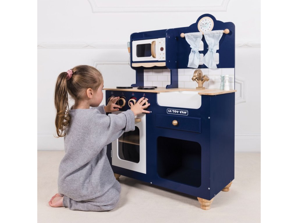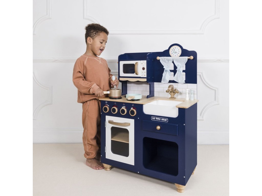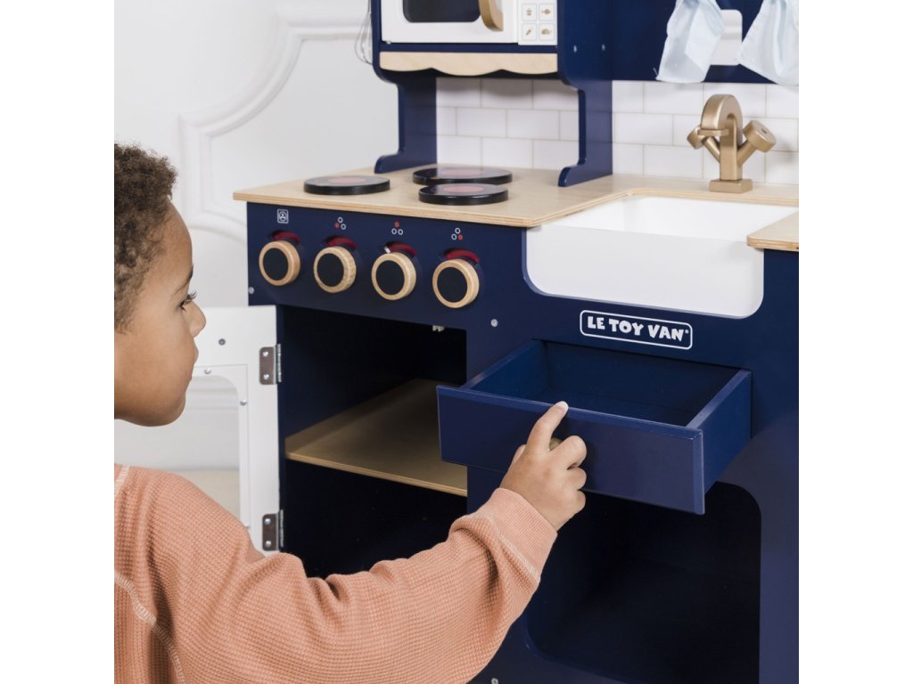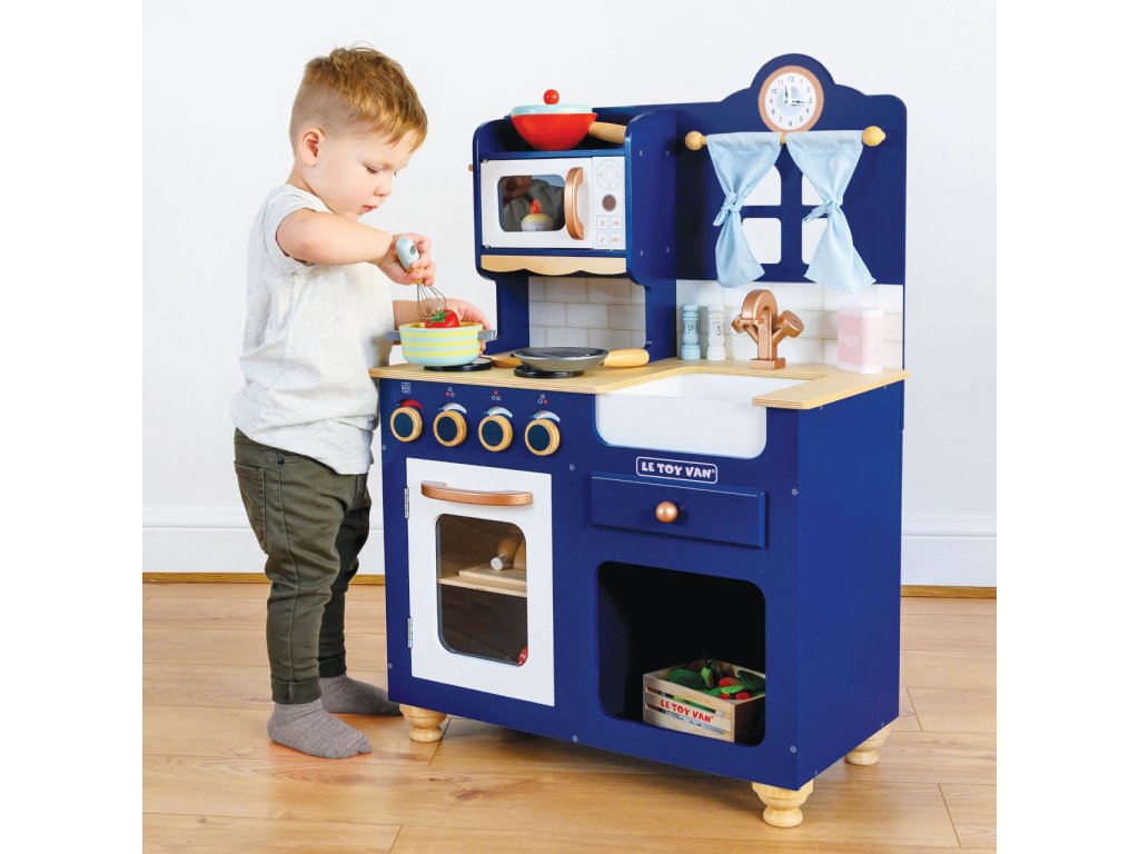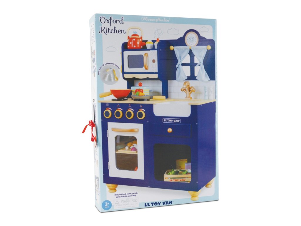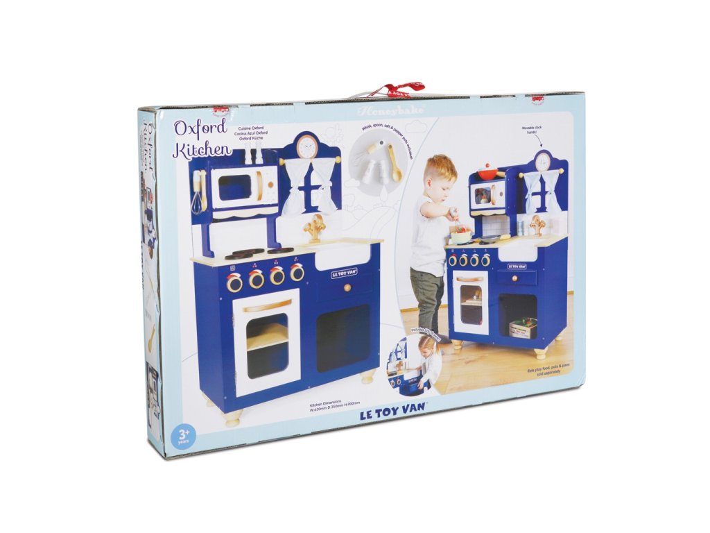 Kuchyňka Oxford je vyrobena z pevného a udržitelného dřeva, originální design z ní dělá unikátní kousek. Je malována v odstínu královské modři, její detaily jsou v barvě mědi. Tato tradiční hračka se bude hodit do každého dětského pokoje, děti nadchne k představivé hře na role. Mezi její funkce patří otevíratelné dveře trouby, otočné knoflíky, dřez, mikrovlnka, roztomilé okno se závěsy a hodiny s otočnými ručičkami. V balení najdete také metličku, vařečku, solničku a pepřenku. Vše pro malé šéfkuchaře a šéfkuchařky. Kuchyňku můžete dovybavit jídlem a doplňky z kolekce Honeybake od Le Toy Van. Krásná hračka, kterou si můžete předávat z generace na generaci. Hračky s účelemVšechny hračky firmy Le Toy Van jsou vyrobeny s cílem – aby dlouho vydržely. Designovány s láskou zkušenými řemeslníky za použití etických praktik a udržitelných materiálů, které jsou laskavější k naší planetě. Hlavní vlastnosti: dřevěná kuchyňka s doplňkyvyrobeno eticky z udržitelného dřevatestováno dle nejpřísnějších standardůmalováno netoxickými barvami na bázi vodyinspiruje ke kreativní a představivé hřepomáhá s rozvojem řeči a sociálních dovednostípodporuje při raném vývoji Honeybake kolekce: Hračky v této kolekci jsou vhodné k objevování, pomohou dětem s rozvojem představivosti, sociálních a verbálních dovedností a kognitivních funkcí. Tradiční design s moderními detaily děti jistě bude bavit. Honeybake je kolekce Le Toy Van, která vyhrála nejvíce ocenění, a to za design, kvalitu, bezpečnost a také za vzdělávací a herní hodnotu.