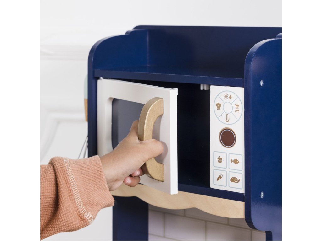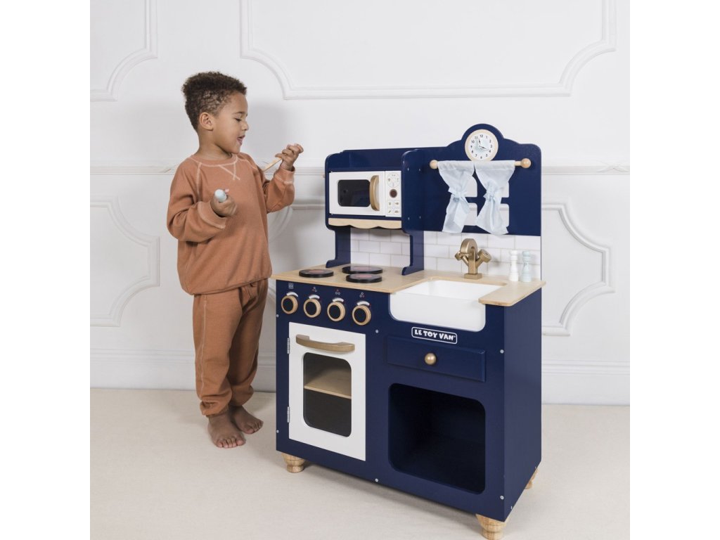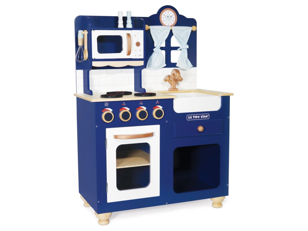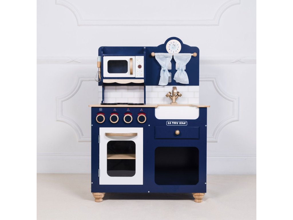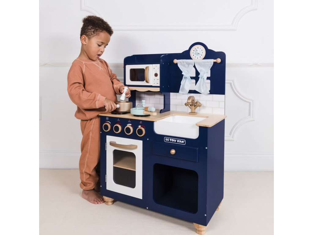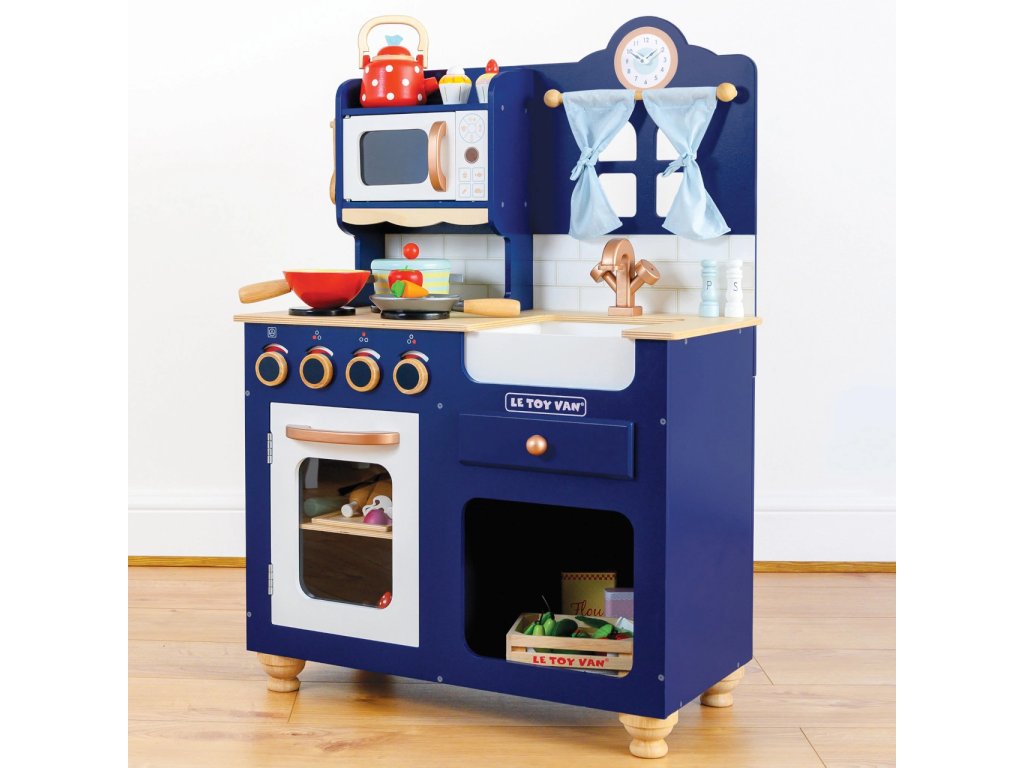 Kuchyňka Oxford je vyrobena z pevného a udržitelného dřeva, originální design z ní dělá unikátní kousek. Je malována v odstínu královské modři, její detaily jsou v barvě mědi. Tato tradiční hračka se bude hodit do každého dětského pokoje, děti nadchne k představivé hře na role. Mezi její funkce patří otevíratelné dveře trouby, otočné knoflíky, dřez, mikrovlnka, roztomilé okno se závěsy a hodiny s otočnými ručičkami. V balení najdete také metličku, vařečku, solničku a pepřenku. Vše pro malé šéfkuchaře a šéfkuchařky. Kuchyňku můžete dovybavit jídlem a doplňky z kolekce Honeybake od Le Toy Van. Krásná hračka, kterou si můžete předávat z generace na generaci. Hračky s účelemVšechny hračky firmy Le Toy Van jsou vyrobeny s cílem – aby dlouho vydržely. Designovány s láskou zkušenými řemeslníky za použití etických praktik a udržitelných materiálů, které jsou laskavější k naší planetě. Hlavní vlastnosti: dřevěná kuchyňka s doplňkyvyrobeno eticky z udržitelného dřevatestováno dle nejpřísnějších standardůmalováno netoxickými barvami na bázi vodyinspiruje ke kreativní a představivé hřepomáhá s rozvojem řeči a sociálních dovednostípodporuje při raném vývoji Honeybake kolekce: Hračky v této kolekci jsou vhodné k objevování, pomohou dětem s rozvojem představivosti, sociálních a verbálních dovedností a kognitivních funkcí. Tradiční design s moderními detaily děti jistě bude bavit. Honeybake je kolekce Le Toy Van, která vyhrála nejvíce ocenění, a to za design, kvalitu, bezpečnost a také za vzdělávací a herní hodnotu.
