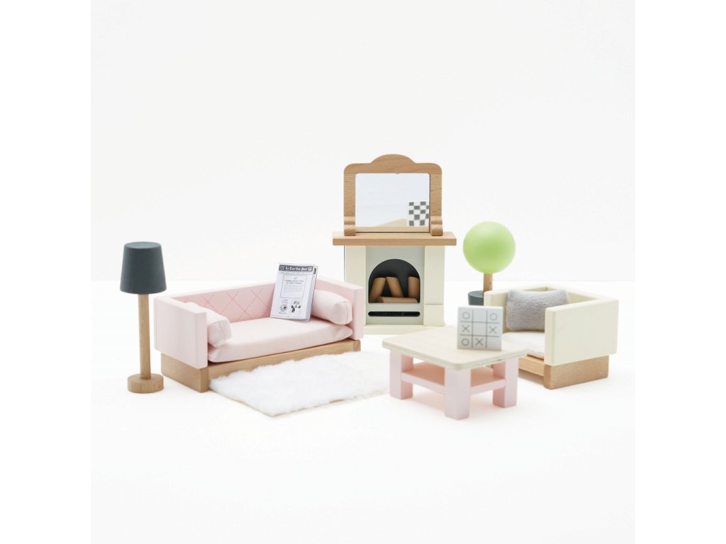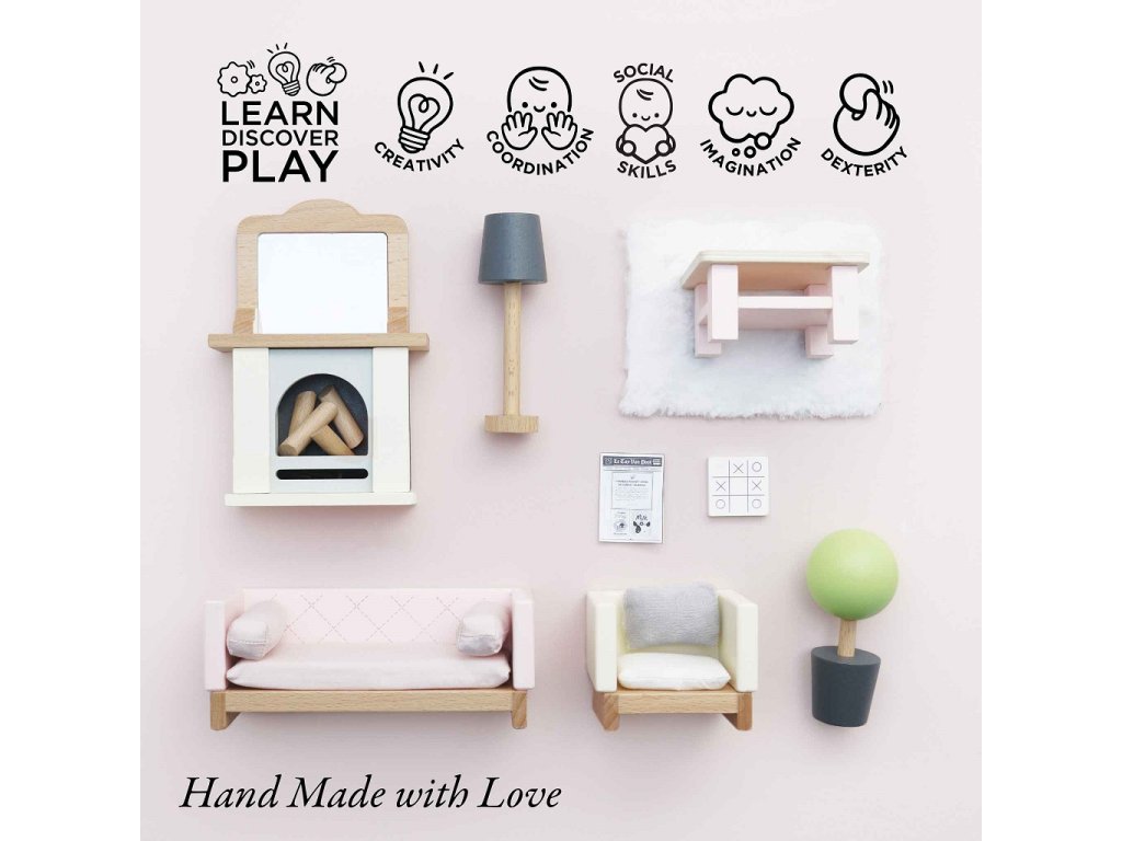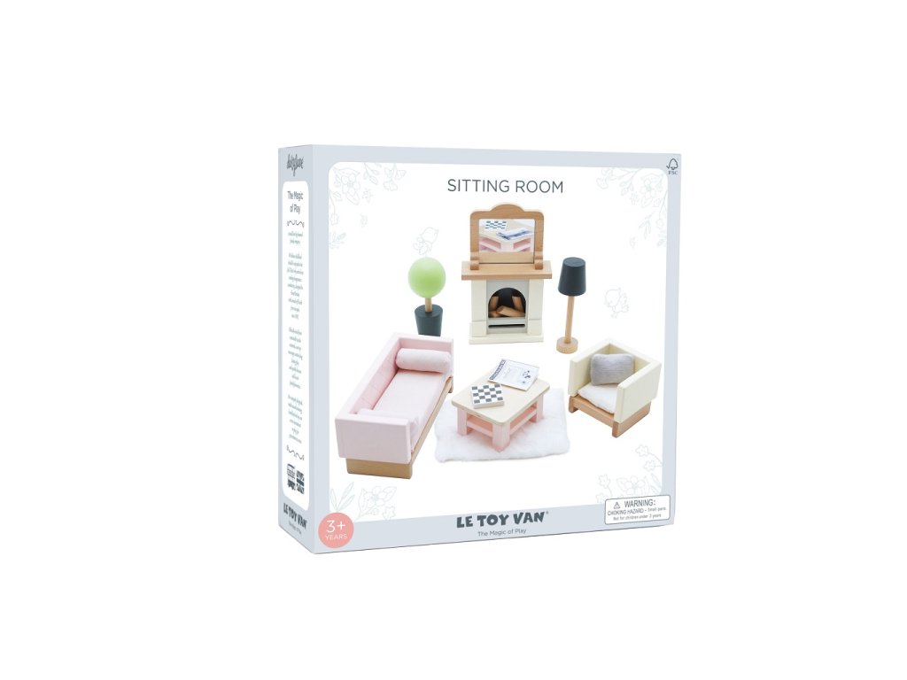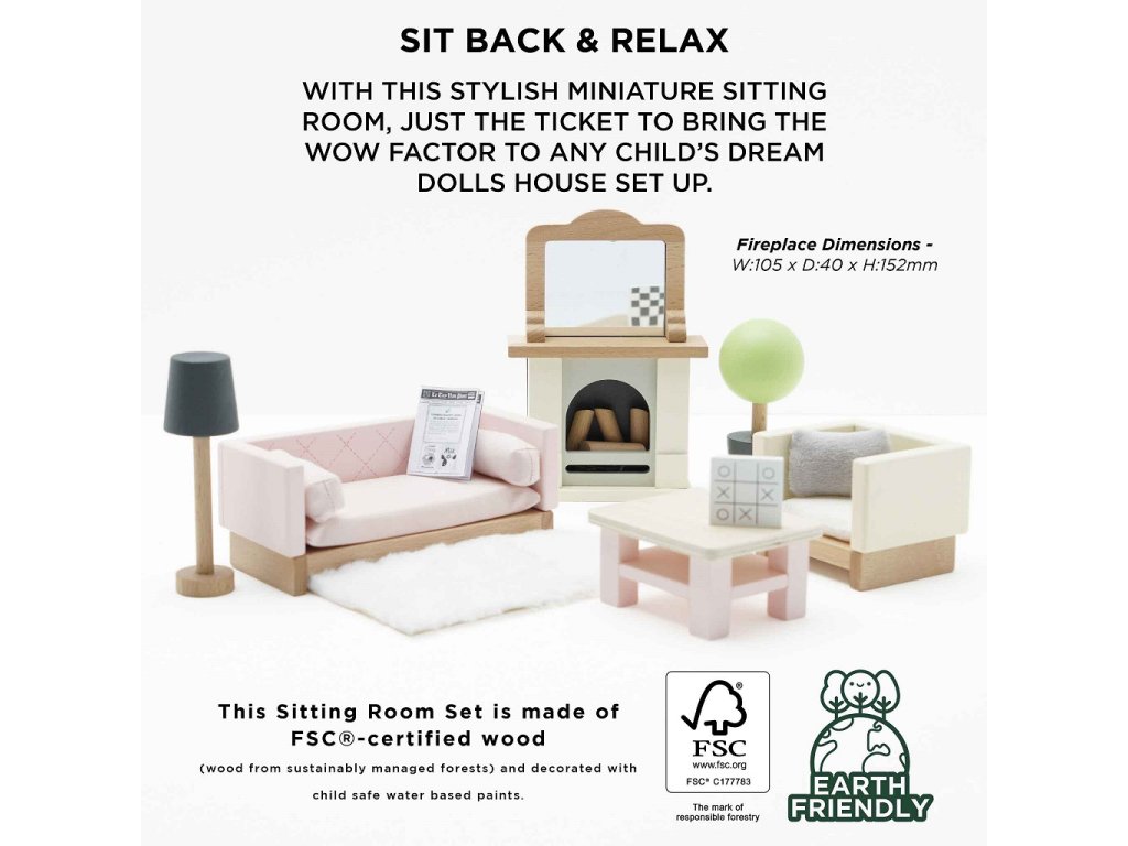 Po dni plném hraní si postavičky odpočinou v tomto krásném obývacím pokoji. Skvěle se hodí do domečků pro panenky, inspirují děti ke hře a rozvíjí jejich představivost. Výbava obývacího pokoje s mnoha detaily je dekorována netoxickými barvami, vyrobena z FSC® dřeva a vydrží dětem po celé generace. Sada se skládá z pohovky a křesla s textilními polštáři, konferenčního stolku, krbu s poleny a zrcadlem pro chladnější odpoledne, koberce, květiny v květináči a lampy. Velikostně se hodí do domečků pro panenky od Le Toy Van, více doplňků domečků z řady Daisylane najdete na našem webu. Hračky s účelemVšechny hračky firmy Le Toy Van jsou vyrobeny s cílem – aby dlouho vydržely. Designovány s láskou zkušenými řemeslníky za použití etických praktik a udržitelných materiálů, které jsou laskavější k naší planetě. Hlavní vlastnosti: vyrobeno eticky z udržitelného dřevatestováno dle nejpřísnějších standardůmalováno netoxickými barvami na bázi vodytrénuje komunikační dovednosti a koordinaciinspiruje ke kreativní a představivé hře Daisylane kolekce: Prestižní kolekce domečků pro panenky a doplňků firmy Le Toy Van. Před více než 25 lety zakladatel Georges navrhl svůj úplně první domeček pro panenky, stavební kámen této firmy. Vyrobeno eticky z udržitelných materiálů, dřevěné domečky pro panenky Daisylane jsou jedinečné a nebudou dětskou představivost držet zpátky. Rodinné dědictví, opravdová investice do hraní. Značka a certifikát FSC® (Forest Stewardship Council) zaručuje, že dřevo, ze kterého byl produkt vyroben, nebylo vytěženo nelegálně a pochází z lesů obhospodařovaných šetrným či přírodě blízkým způsobem, ve kterém jsou dodržovány přísné environmentální a sociální požadavky. Značka FSC® na výrobku znamená, že svým nákupem pomáháte chránit lesy a podporujete šetrné, odpovědné či přírodě blízké hospodaření, díky kterému jsou naše lesy stabilnější, zdravější, mají přirozenou druhovou skladbu a lépe odolávají negativním následkům klimatických změn.