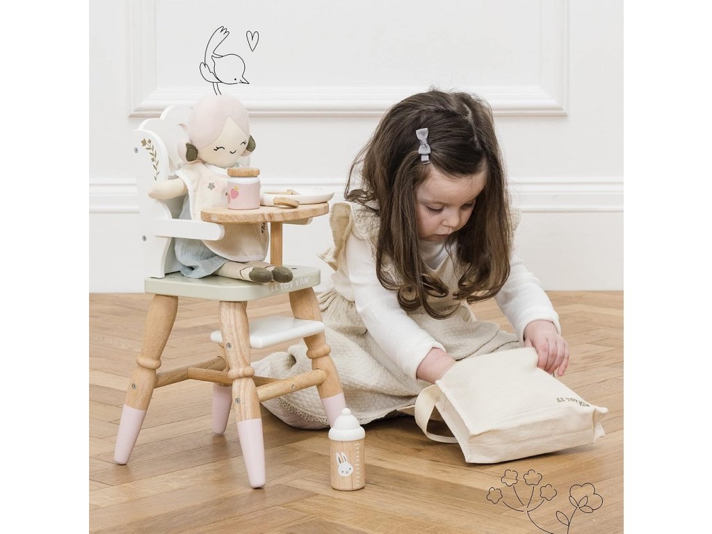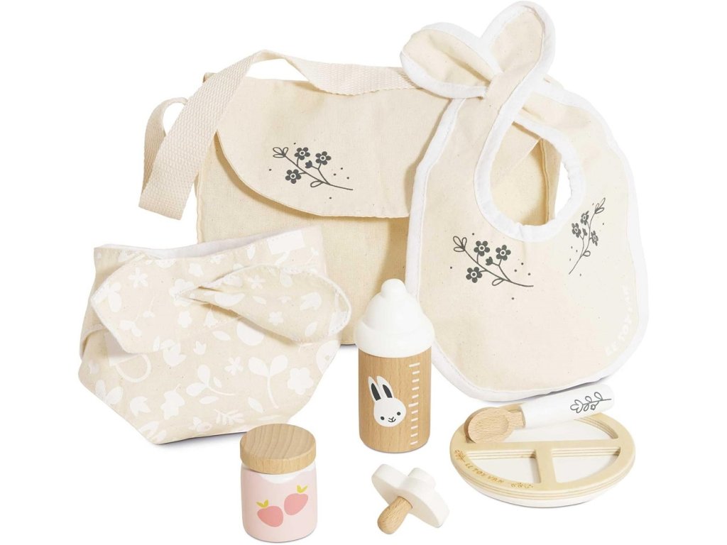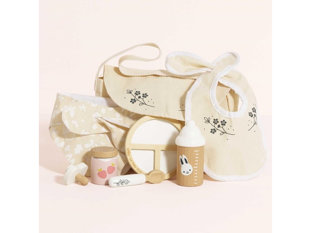 Představivá sada pro malé pečovatele a pečovatelky. Tato krásná souprava obsahuje vše, co budou děti pro péči o plyšáky a panenky potřebovat. V balení roztomilá textilní přebalovací taška s popruhem, s ozdobnou ilustrací listů. Uvnitř najdete všechny nezbytnosti, dudlík, bryndák, plenku, talíř, lžíci, přesnídávku a lahvičku. Vyrobeno s láskou z kombinace přírodní bavlny a pevného dřeva. Všechny doplňky jsou vhodné pro plyšáky a panenky ve velikosti cca 30 až 35 cm. Hračky s účelemVšechny hračky firmy Le Toy Van jsou vyrobeny s cílem – aby dlouho vydržely. Designovány s láskou zkušenými řemeslníky za použití etických praktik a udržitelných materiálů, které jsou laskavější k naší planetě. Hlavní vlastnosti: pro plyšáky a panenky ve velikosti cca 30 až 35 cmvyrobeno eticky z udržitelného dřevamalováno netoxickými barvami na bázi vodytestováno dle nejpřísnějších standardůpodporuje představivost, hraní na rolepomáhá s rozvojem řeči a sociálních dovedností Ocenění hračky:Independent Toy Gold Award 2021 Honeybake kolekce: Hračky v této kolekci jsou vhodné k objevování, pomohou dětem s rozvojem představivosti, sociálních a verbálních dovedností a kognitivních funkcí. Tradiční design s moderními detaily děti jistě bude bavit. Honeybake je kolekce Le Toy Van, která vyhrála nejvíce ocenění, a to za design, kvalitu, bezpečnost a také za vzdělávací a herní hodnotu.