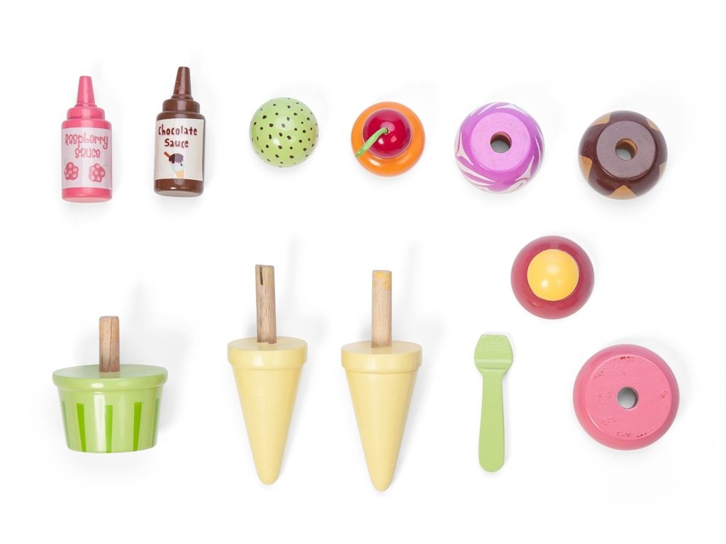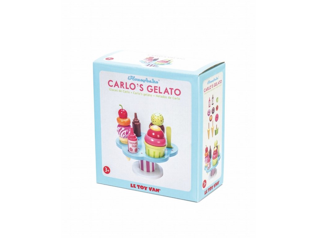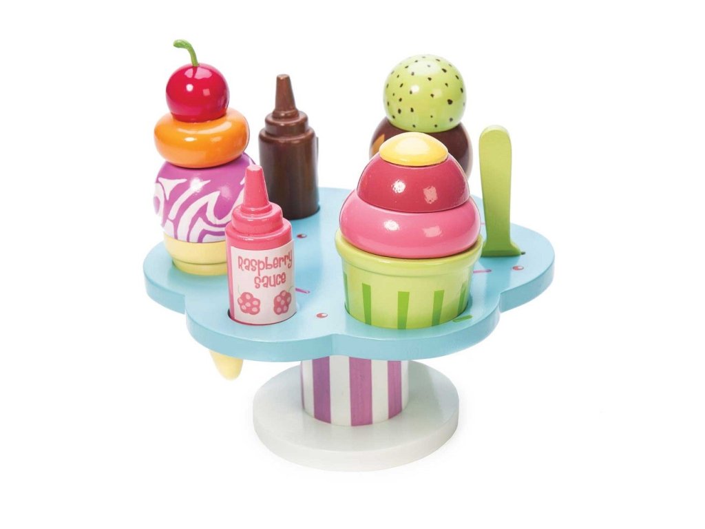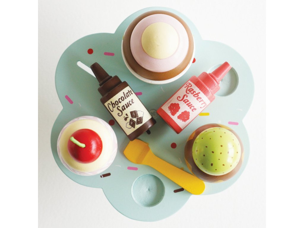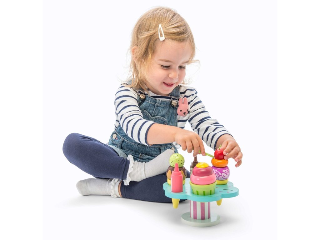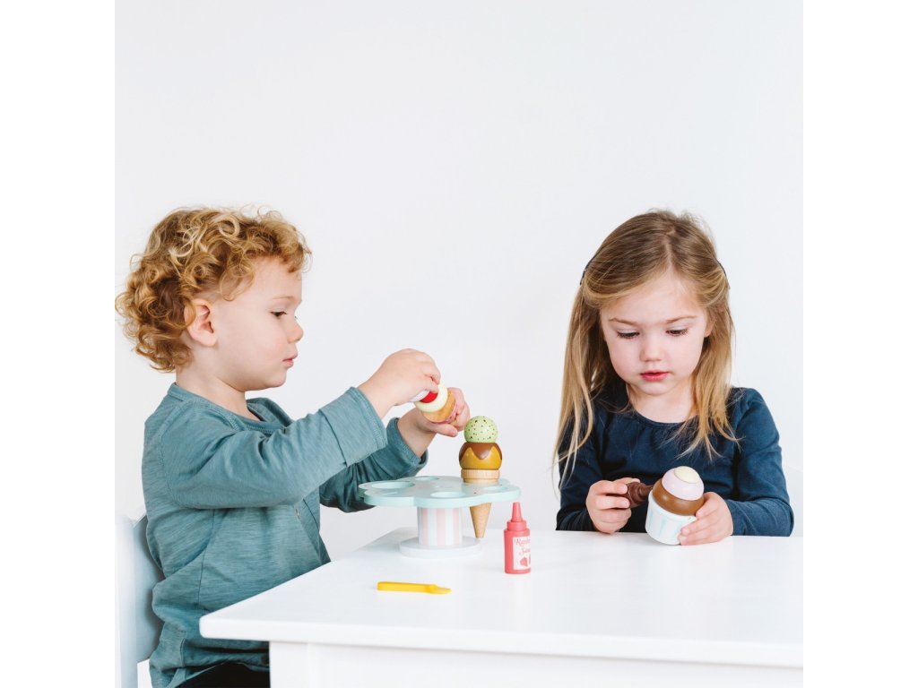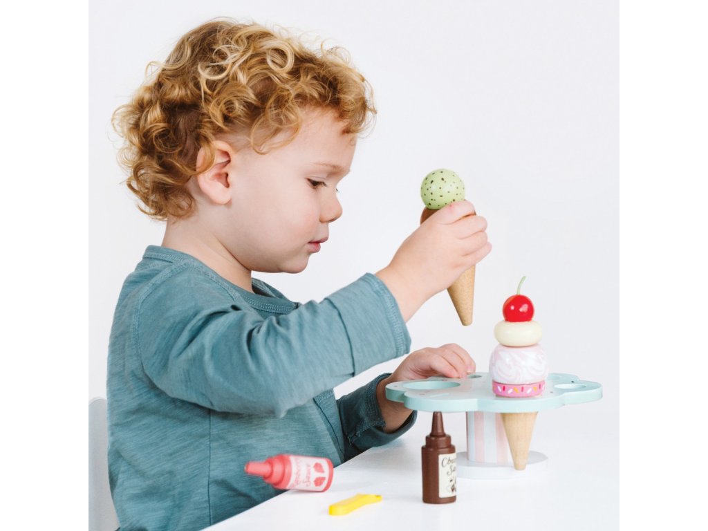 Kopeček nebo dva? Děti si s touto představivou hračkou na role užijí mnoho zábavy. Děti mohou zmrzlinu servírovat v kelímku nebo kornoutku, lze vybrat ze dvou topingů i posypek, nechybí ani lžička. Perfektní hračka nejen pro teplé letní měsíce. Vyrobeno z odolného a udržitelného FSC® dřeva, malováno netoxickými barvami na bázi vody. Hračky s účelemVšechny hračky firmy Le Toy Van jsou vyrobeny s cílem – aby dlouho vydržely. Designovány s láskou zkušenými řemeslníky za použití etických praktik a udržitelných materiálů, které jsou laskavější k naší planetě. Hlavní vlastnosti: vyrobeno eticky z udržitelného dřevatestováno dle nejpřísnějších standardůmalováno netoxickými barvami na bázi vodyinspiruje k představivé hřerozvíjí kognitivní dovednosti Honeybake kolekce: Hračky v této kolekci jsou vhodné k objevování, pomohou dětem s rozvojem představivosti, sociálních a verbálních dovedností a kognitivních funkcí. Tradiční design s moderními detaily děti jistě bude bavit. Honeybake je kolekce Le Toy Van, která vyhrála nejvíce ocenění, a to za design, kvalitu, bezpečnost a také za vzdělávací a herní hodnotu.