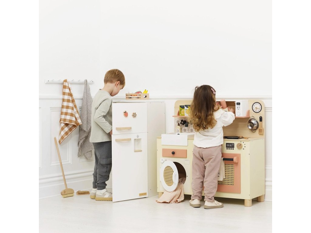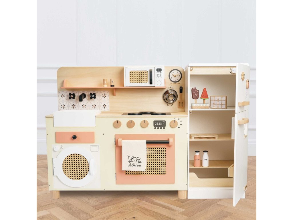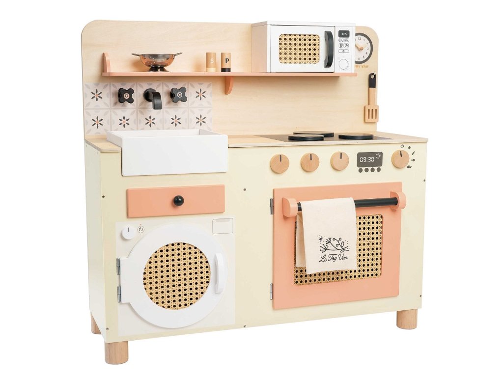 Uvařte si nebeské pokrmy s touto dřevěnou kuchyňkou snů v retro stylu. Je nabitá interaktivními funkcemi pro hodiny realistického hraní rolí. Objevte dřez, troubu, pračku, otočné kohoutky a fungující ciferníky trouby. Navíc je tu mikrovlnná trouba, hodiny a spousta úložného prostoru. Kuchyňka je vyrobena ze dřeva s certifikací FSC® (dřevo z lesů obhospodařovaných udržitelným způsobem) a zdobena barvami na vodní bázi bezpečnými pro děti. Díky designu kombinující jemné pastelové barvy s přírodním provedením, pěknými potištěnými dlaždicemi a ratanovými detaily se stává skvělým dopňkem do každého pokojíku! Hračky s účelemVšechny hračky firmy Le Toy Van jsou vyrobeny s cílem – aby dlouho vydržely. Designovány s láskou zkušenými řemeslníky za použití etických praktik a udržitelných materiálů, které jsou laskavější k naší planetě. Hlavní vlastnosti: vyrobeno eticky z FSC udržitelného dřevamalováno netoxickými barvami na bázi vodytestováno dle nejpřísnějších standardůobsahuje kuchyň, cedník, utěrku, mikrovlnku, sůl a pepřinspiruje k nápadité hře Značka a certifikát FSC® (Forest Stewardship Council) zaručuje, že dřevo, ze kterého byl produkt vyroben, nebylo vytěženo nelegálně a pochází z lesů obhospodařovaných šetrným či přírodě blízkým způsobem, ve kterém jsou dodržovány přísné environmentální a sociální požadavky. Značka FSC® na výrobku znamená, že svým nákupem pomáháte chránit lesy a podporujete šetrné, odpovědné či přírodě blízké hospodaření, díky kterému jsou naše lesy stabilnější, zdravější, mají přirozenou druhovou skladbu a lépe odolávají negativním následkům klimatických změn.