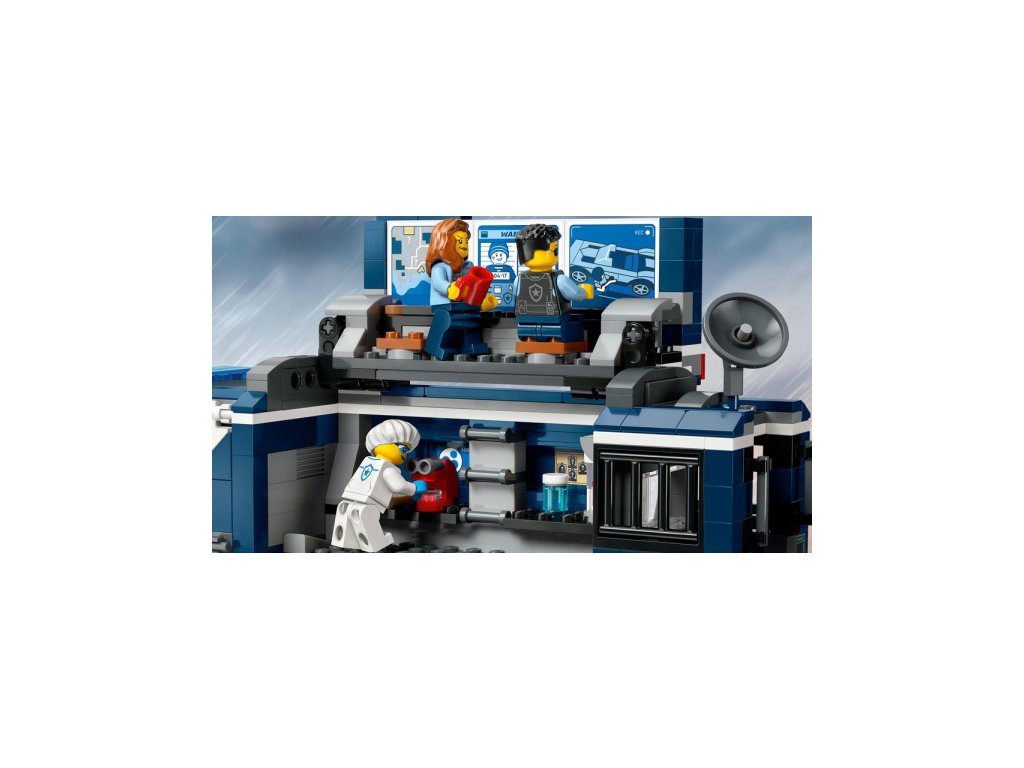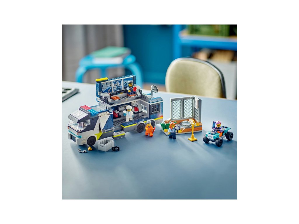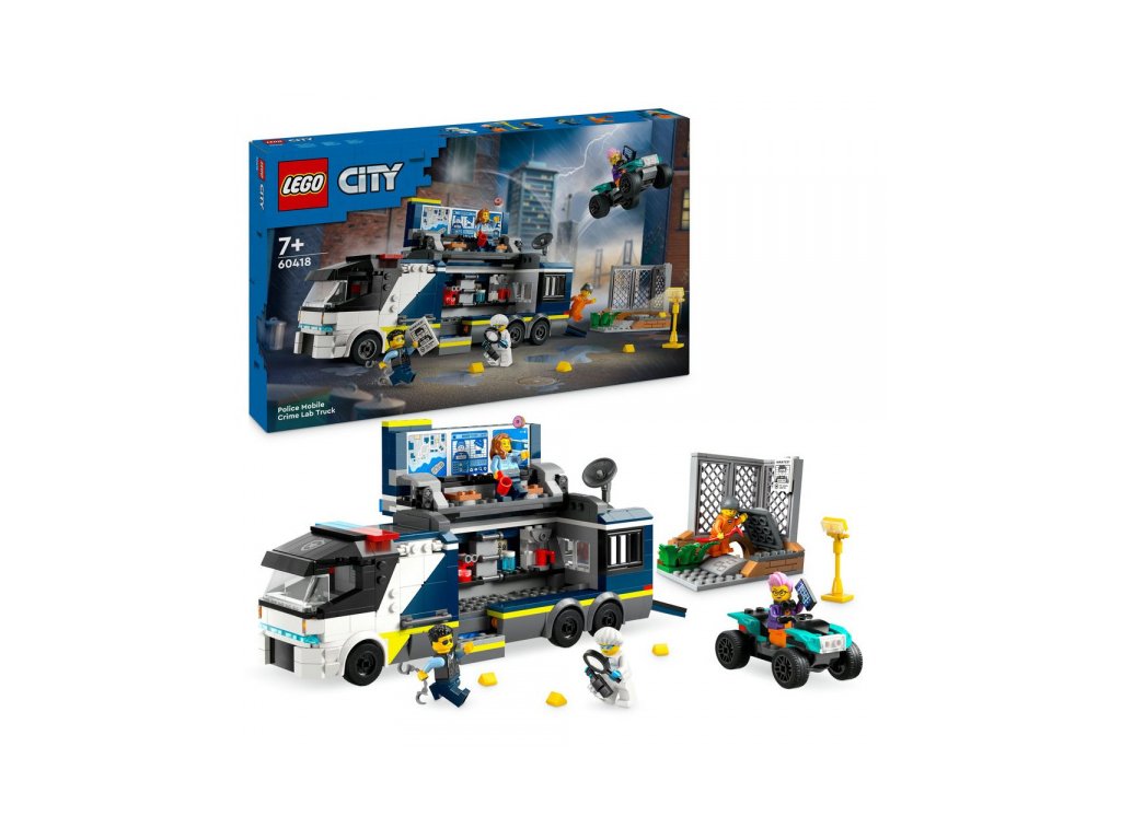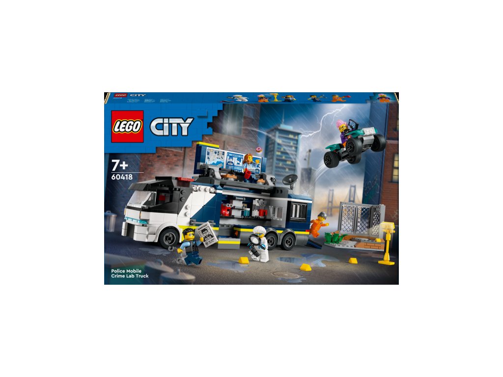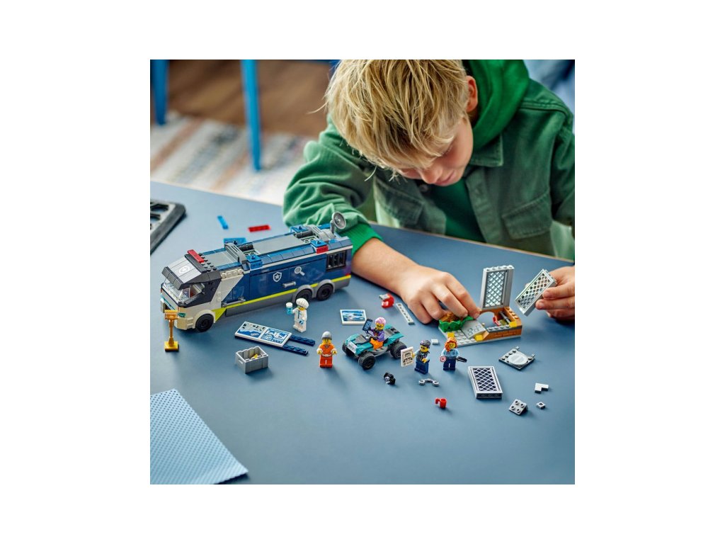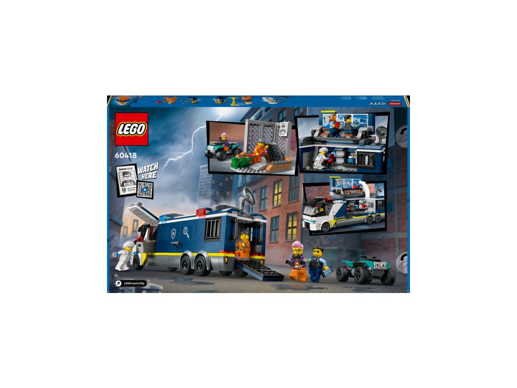 Zločinci nemají v LEGO® City šanci. Jsou jim na stopě policisté, kteří prohledají místo činu a pak vše prozkoumají v mobilní kriminalistické laboratoři, která obsahuje pracoviště, monitory, mikroskop i vězeňskou celu. Součástí stavebnice je také plakát "Policie pátrá" s QR kódem. Když ho naskenuješ, můžeš si užít zábavné videodobrodružství z LEGO® City. Stavebnici lze samozřejmě kombinovat s dalšími budovami či dopravními prostředky.