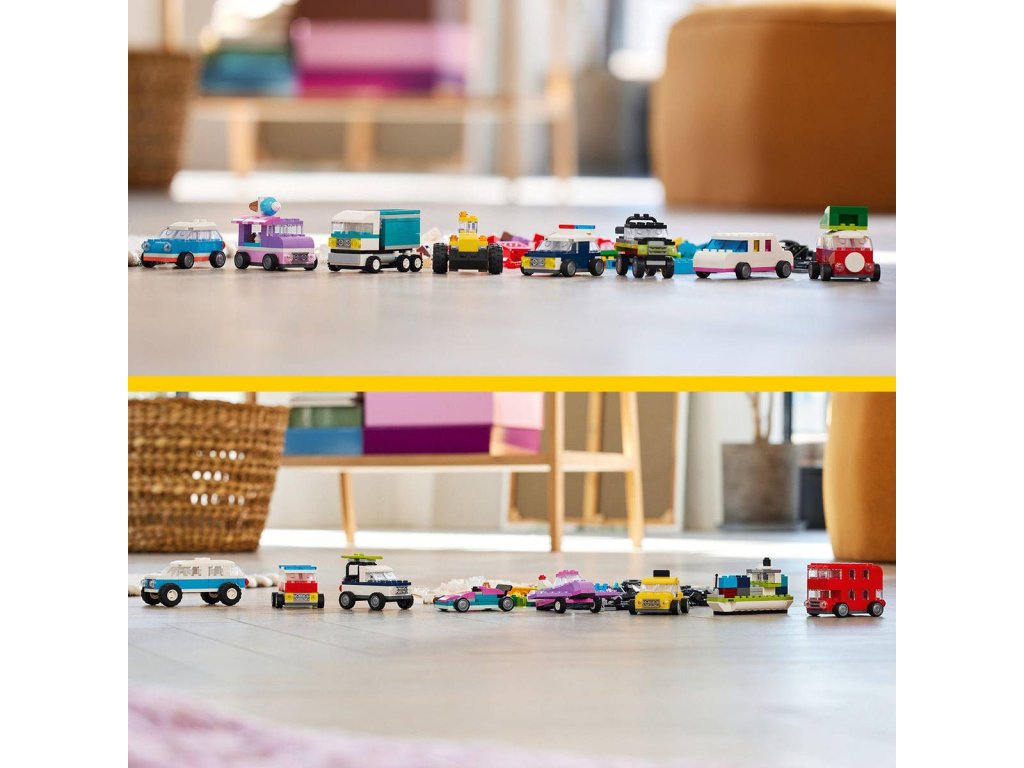 Malí nadšenci do aut od 5 let si přímo zamilují stavebnici Tvořivá vozidla. Z této inspirativní sady pestrobarevných dílků a kostek lze postavit řadu vozidel a v balení najdete také jednoduché návody na sestavení neomezeně přestavitelných vozů. S touto stavebnicí s 900 kostkami, speciálními dílky, 52 koly a jednoduchými návody se děti mohou vrhnout do stavění modelu policejního auta, zmrzlinářského vozu, čtyřkolky, čelního nakladače, nákladního auta, kombi osobního auta, terénního vozu a limuzíny. Malí stavitelé mohou upravovat modely podle vlastních stylů, přidávat parádní detaily nebo barevné ozdoby a vytvářet zcela nová vozidla. Součástí je 10 inspirativních tipů na stavění. Děti najdou návody také v aplikaci LEGO Builder, kde lze přibližovat a otáčet modely a sledovat postup.