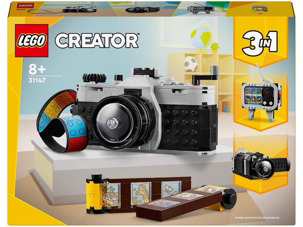 Inspirujte děti od 8 let k nápaditému hraní se stavebnicí Retro fotoaparát. Model fotoaparátu má pohyblivý objektiv, na horní straně najdete tlačítka k pořízení fotografie a vzadu je otvor, do kterého můžete umístit film z kostek a barevný textilní pásek na nošení. Součástí je také 6 samolepek, které představují fotografie a děti je nalepí na jednotlivá filmová políčka. Tato stavebnice LEGO Creator 3 v 1 dětem přináší možnost postavit si hned 3 různé retro modely z jedné sady kostek. Postaví si model fotoaparátu, který pak přestaví na retro kameru a tu zase přeskládají na retro televizi s anténou. Všechny 3 modely se budou skvěle vyjímat na výstavce v dětském pokoji.
