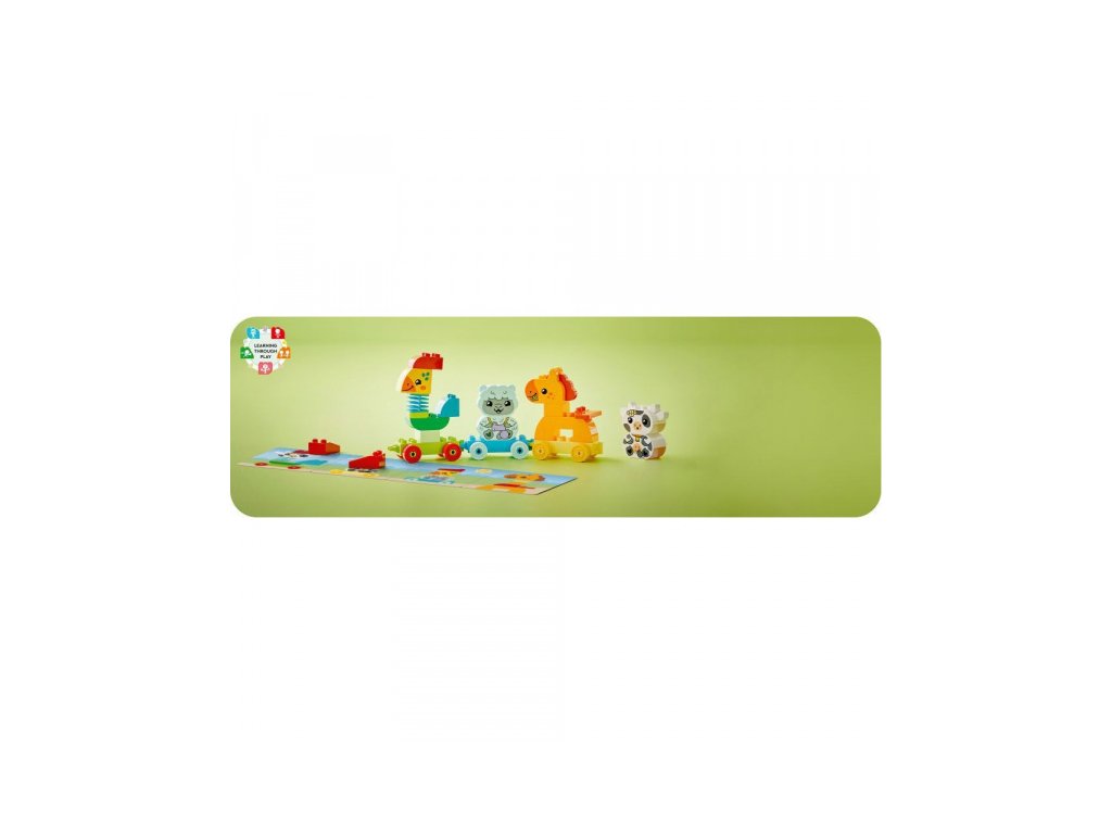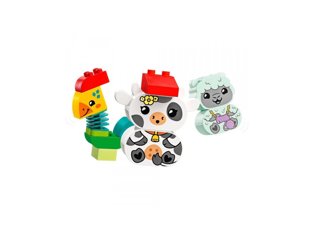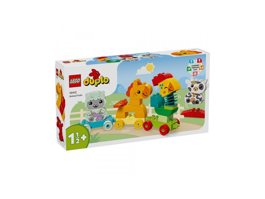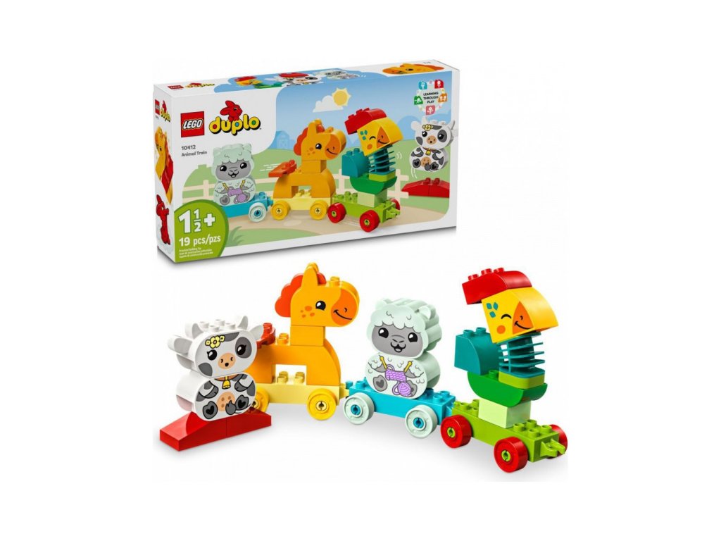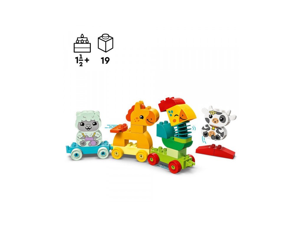 LEGO® vláček se 4 roztomilými zvířátky naučí děti poznávat barvy a stavět podle předlohy nebo vlastní fantazie. Figurka kohoutka má pohyblivý krk, takže si děti užijí spoustu zábavy a rozvinou své motorické schopnosti. Děti si pomocí LEGO® vláčku snadno osvojí různé barvy. Zvířátka mohou přiřazovat ke stejnobarevným vagónkům. Na malé stavitele se těší sestavitelné jehňátko, kravička, koník a kohout s hýbacím krkem pro ještě lepší zábavu.