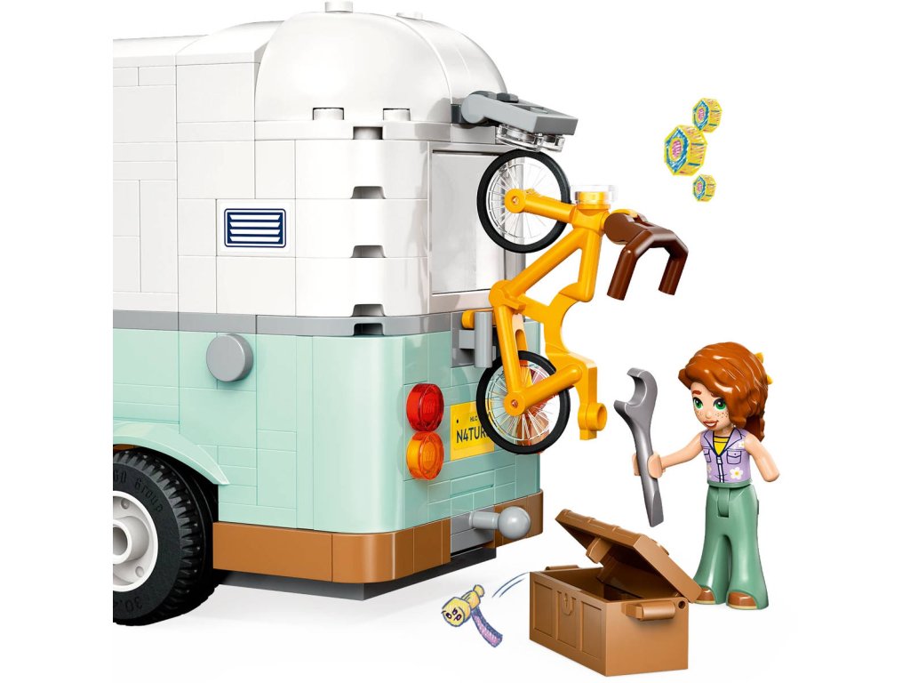 Holky a kluci od 7 let si se stavebnicí Dobrodružství s karavanem přátelství užijí spoustu zábavy. Sada obsahuje sestavitelné vozidlo LEGO, 3 minipanenky a figurku fretky. V této stavebnici karavanu pro děti najdete vše, co malí průzkumníci potřebují k vyprávění vlastních příběhů o kempování. Kamarádi sedí v kabině řidiče a hledají dokonalé místo na zaparkování v lese. Otevřete karavan a odhalte vybavenou kuchyň a toaletu. Zaručeně uslyšíte chichot, když děti uvidí, jak po „spláchnutí“ záchodu mizí odpad! Schody vedou do prostoru na spaní, kde je postel pro každou ze 3 minipanenek. Mezi další detaily patří kolo, na kterém mohou postavičky jezdit, piknikový stůl s židlemi, venkovní sprcha a kempingové doplňky včetně kompasu, klíče a dalekohledu. Objevte další zábavné hračky ze světa LEGO Friends (prodávají se samostatně), ve kterých vás čeká spousta dalších příběhů o přátelství.