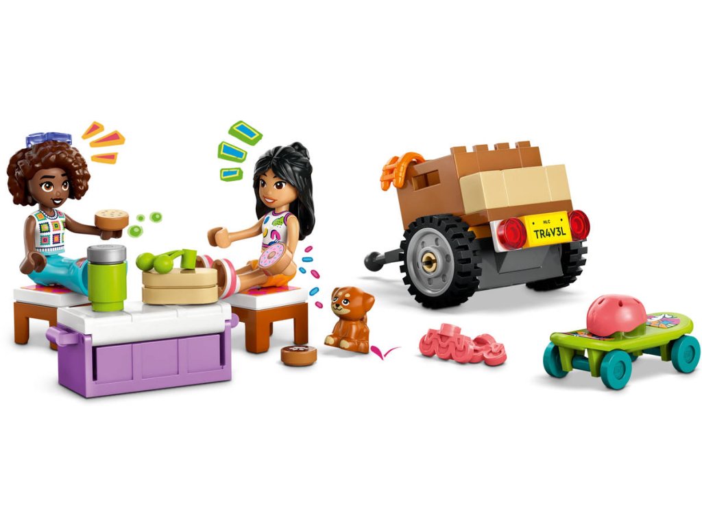 Vstupte do světa dobrodružství se stavebnicí Výlet v autě s přáteli pro holky a kluky od 6 let. Tato akcí nabitá stavebnice obsahuje model auta s přívěsem, 2 minipanenky LEGO Friends, roztomilou figurku štěňátka a spoustu doplňků, které inspirují k zábavnému hraní. Vydejte se s dětmi na kreativní cestu a pomozte Liann a Aliye naložit do auta a odnímatelného přívěsu vše, co potřebují na cestu. Kamarádky sedí vepředu – vzadu v autě je sedadlo pro pejska Airu. Mezi doplňky najdete kajak, 2 helmy, skateboard, kolečkové brusle, 2 židle a chladicí box se sendvičem, donutem, sušenkou, třešněmi a pamlsky pro psa. Až přijde čas na svačinu, chladicí box poslouží i jako piknikový stůl.