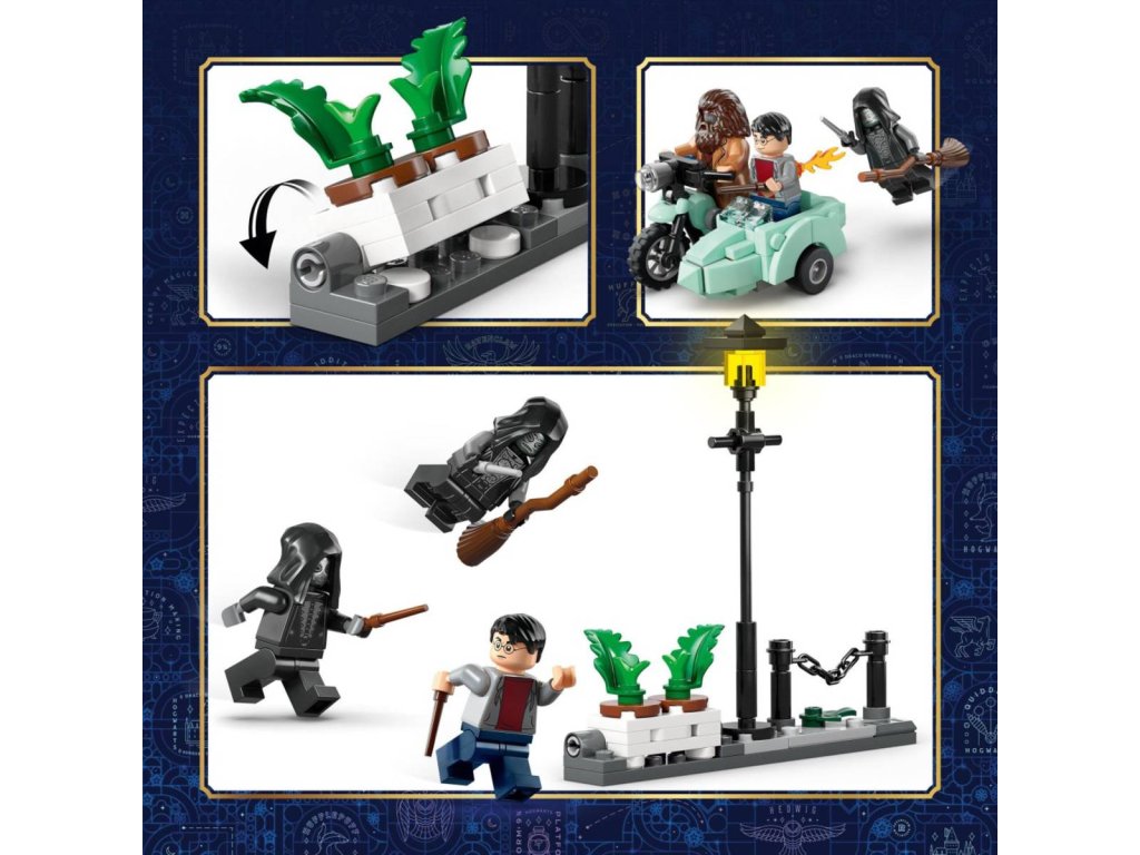 Připomeňte si útěk Hagrida a Harryho Pottera ze Zobí ulice před Smrtijedy z filmu Harry Potter a Relikvie smrti s touto stavebnicí LEGO® Harry Potter™ pro děti, ve které najdete motorku. Tato kouzelná stavebnice představuje zábavný dárek knarozeninám pro kluky, holky a fanoušky od 8 let. Součástí je první model LEGO Hagridovy létající motorky v měřítku minifigurek, 4 minifigurky LEGO Harry Potter™ a miniaturní scénu Zobí ulice, která inspiruje ke kreativnímu hraní. Usaďte minifigurku Ru beuse Hagrida na motorku a Harryho Pottera do postranního vozíku. Umístěte 2 minifigurky Smrtijedů do scény Zobí ulice, kde najdete také lampu a květináč, který lze během odvážného útěku hrdinů převrátit.