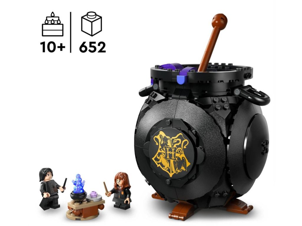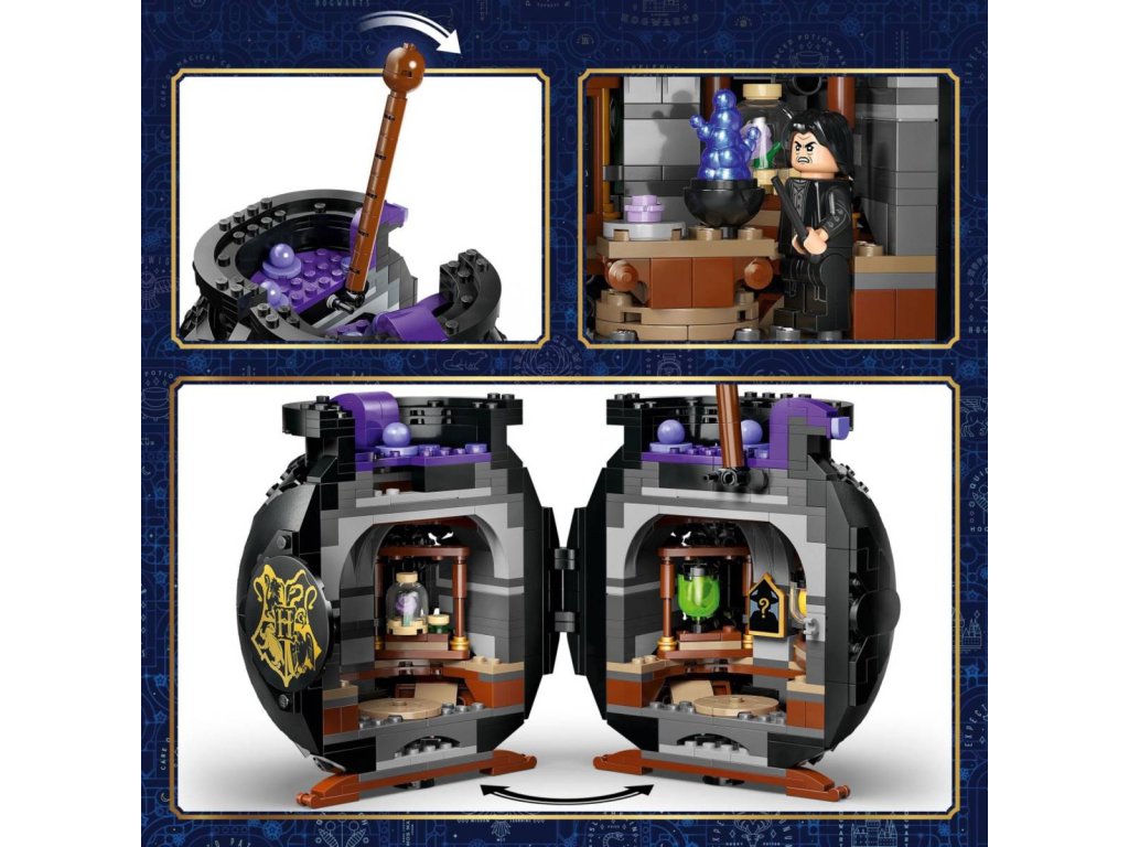 Darujte dětem kouzelnou stavebnici LEGO® Harry Potter™ na hraní i vystavení - kouzelný kotlík s tajnou učebnou lektvarů uvnitř. Posunutím míchátka odhalíte propracovanou učebnu s odnímatelnými lavicemi, lahvičkami s lektvary a přísadami z kostek LEGO. Zahrajte si na vlastní hodinu lektvarů v Bradavicích s minifigurkami profesora Snapea a Hermiony Grangerové. Najděte Hermionina patrona v podobě vydry, který je součástí kolekce patronů k 25. výročí řady LEGO Harry Potter (stavebnice se prodávají samostatně), a 1 ze 14 sběratelských bradavických portrétů Bublající kotlík z kostek se bude skvěle vyjímat na výstavce v pokoji a poslouží také jako skvělá halloweenská dekorace. Darujte tuto univerzální stavebnici jako kreativní dárek holkám, klukům a fandům Harryho Pottera od 10 let.