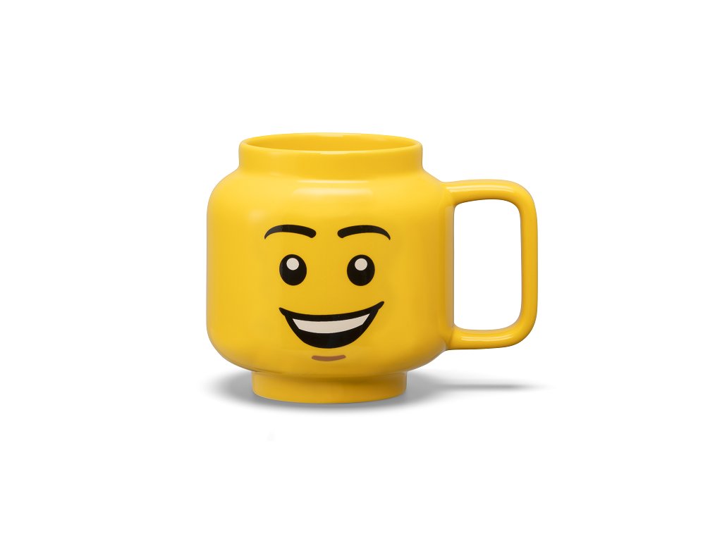 • Žlutý, keramický hrnek v podobě klasické hlavy minifigurky s potiskem veselého obličeje.